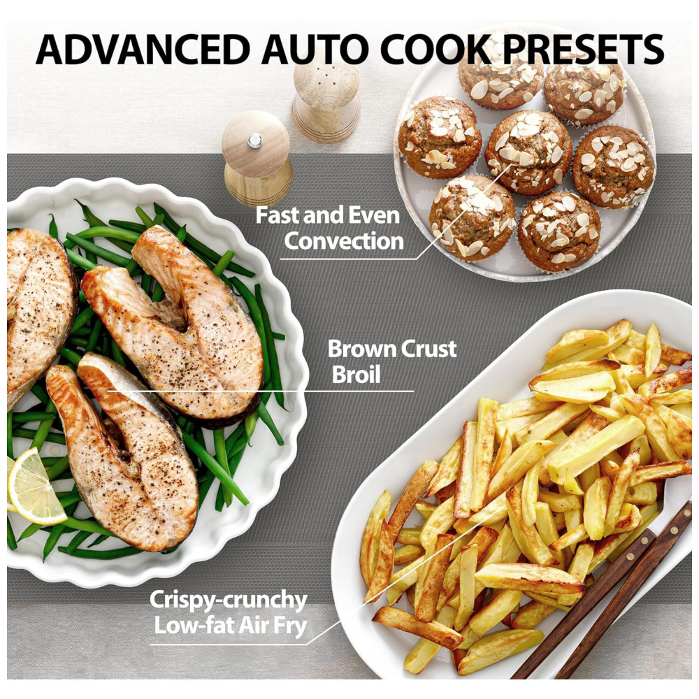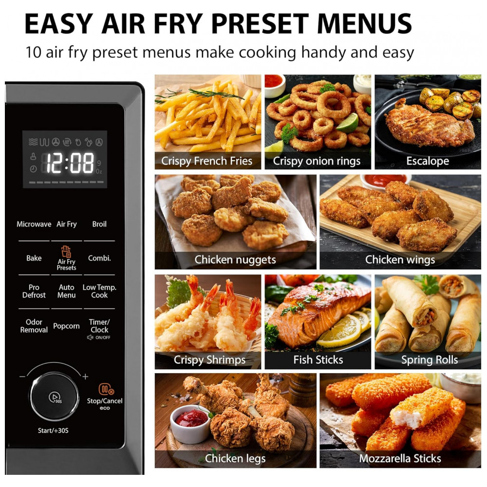 O Forno Micro-ondas de Bancada TOSHIBA é um verdadeiro 8 em 1, com funções de micro-ondas, air fryer, assar, grelhar, combi, baixa temperatura, remoção de odores e descongelamento. Desfrute de alimentos fritos de forma saudável com menos gordura usando o air fryer. Com potência de saída de micro-ondas de 1000 watts e potência de entrada de 1600 watts. Compacto, mas com capacidade generosa, este forno possui uma prateleira giratória removível de 31,5 cm que pode acomodar um frango inteiro assado, pizza e uma assadeira. Além disso, possui recursos convenientes como pipoca com um toque, botões de fácil manuseio, prateleira giratória com memória de posição, cozimento rápido, cozimento em vários estágios, relógio, timer de cozinha e função muda. Seu design elegante em aço inoxidável preto clássico é fácil de limpar e combina com qualquer cozinha.