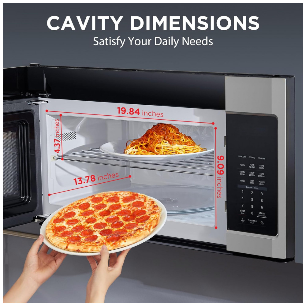 Agora você pode ter mais praticidade e estilo na sua cozinha com o Forno Micro-ondas Over The Range BLACK+DECKER EM044KB19. Com capacidade de 53,80 litros e 1000 watts de potência, este micro-ondas conta com 10 níveis de potência, sistema de ventilação de dois velocidades com 400 CFM e prato giratório de 34,29 cm. O recurso de cozimento com um toque ajusta automaticamente a potência e o tempo para diferentes alimentos, como pipoca, batata, vegetais, pizza, petiscos, bacon, jantar congelado, arroz e café da manhã congelado. Além disso, vem com uma prateleira para cozimento/reaquecimento em dois níveis. As opções pré-programadas para diversos alimentos facilitam o preparo das suas refeições diárias. Com iluminação LED no cooktop, oferece uma visão clara e brilhante das suas refeições. O sistema de ventilação de duas velocidades garante um ambiente mais limpo e livre de odores. Com a função de ligar/desligar o prato giratório, você pode preparar pratos maiores com facilidade. Tudo isso em um design elegante de aço inoxidável. Dimensões externas: 39,88 cm x 74,93 cm x 41,66 cm (L x P x A), Dimensões internas: 50,39 cm x 35,05 cm x 23,09 cm (L x P x A), Diâmetro do prato giratório: 34,29 cm.
