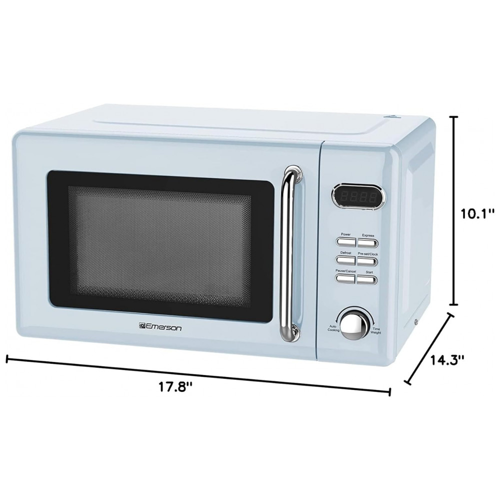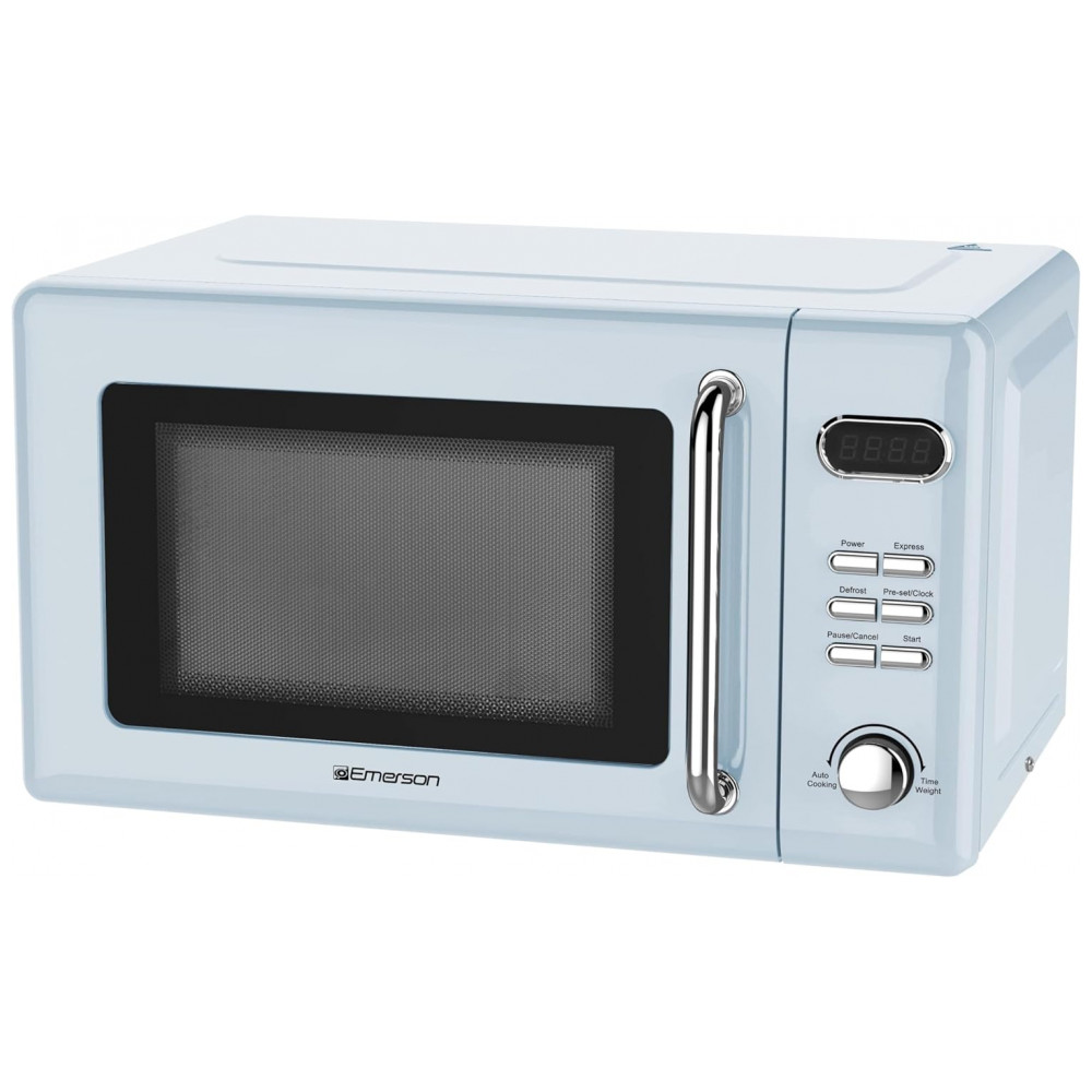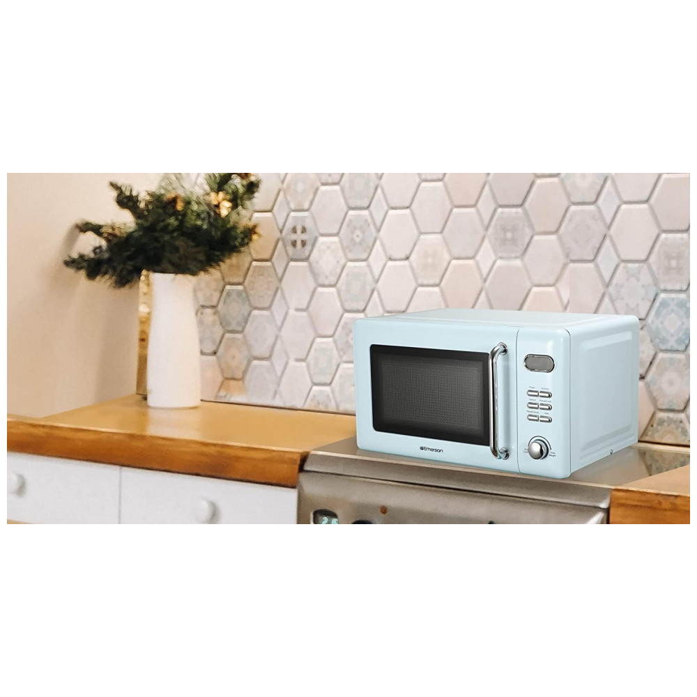 O forno micro-ondas retrô Emerson MWR7020BL é um modelo compacto de bancada com capacidade aproximada de 20 litros, indicado para uso residencial em aquecimento, preparo rápido de refeições e descongelamento de alimentos. Com potência de 700W e 5 níveis de potência, permite selecionar a intensidade adequada para diferentes tipos de alimentos, contribuindo para um aquecimento mais uniforme com apoio do prato giratório de vidro.