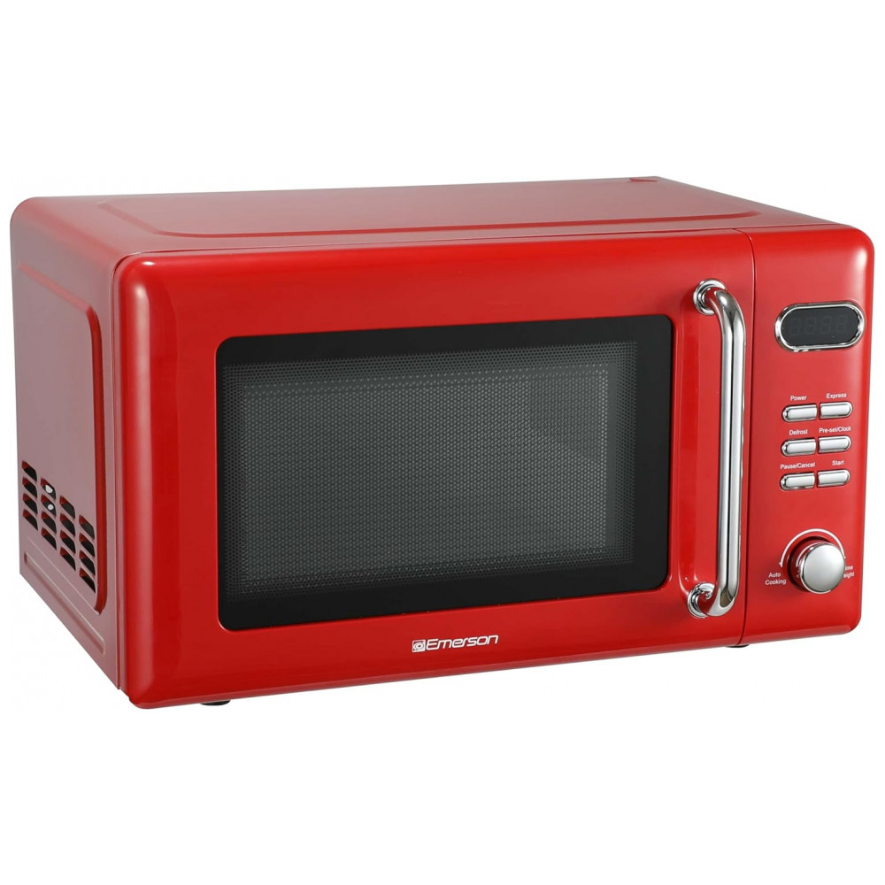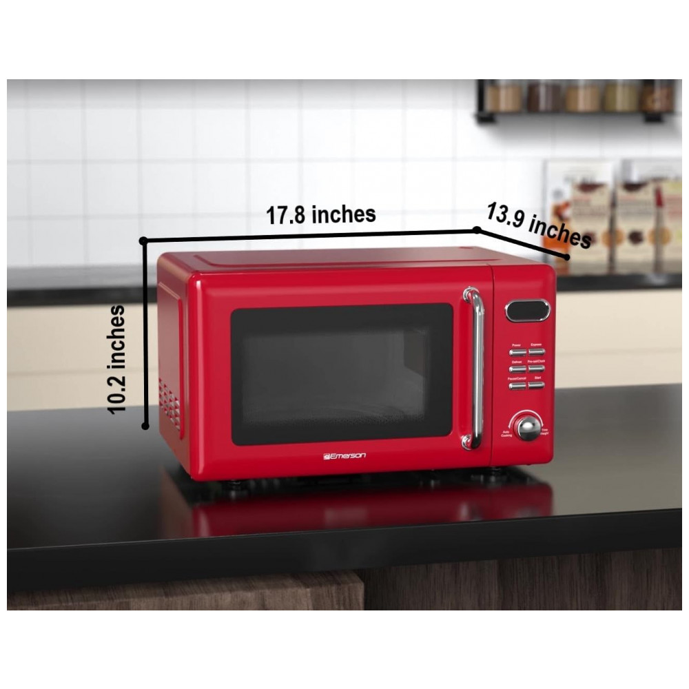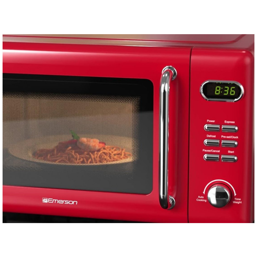 O forno micro-ondas retrô Emerson MMWR7020RD é um modelo compacto de bancada com capacidade aproximada de 20 litros, indicado para uso residencial em aquecimento, preparo rápido de refeições e descongelamento de alimentos. Com potência de 700W e 5 níveis de potência, permite selecionar a intensidade adequada para diferentes tipos de alimentos, contribuindo para um aquecimento mais uniforme com apoio do prato giratório de vidro.