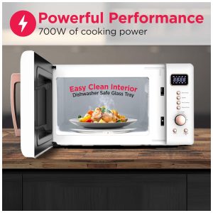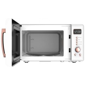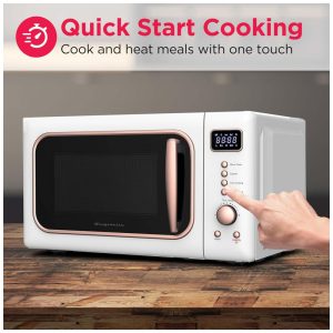 O painel combina botões de toque com um grande knob retrô para seleção de tempo e funções, incluindo menus de cozimento com um toque, timer digital e opções de descongelamento por tempo ou peso. O equipamento dispõe ainda de trava de segurança para crianças, diferentes níveis de potência e funções de cozimento rápido, mantendo operação prática e objetiva.