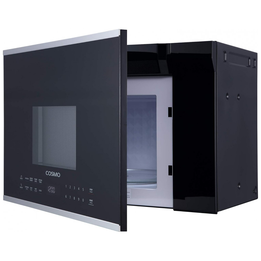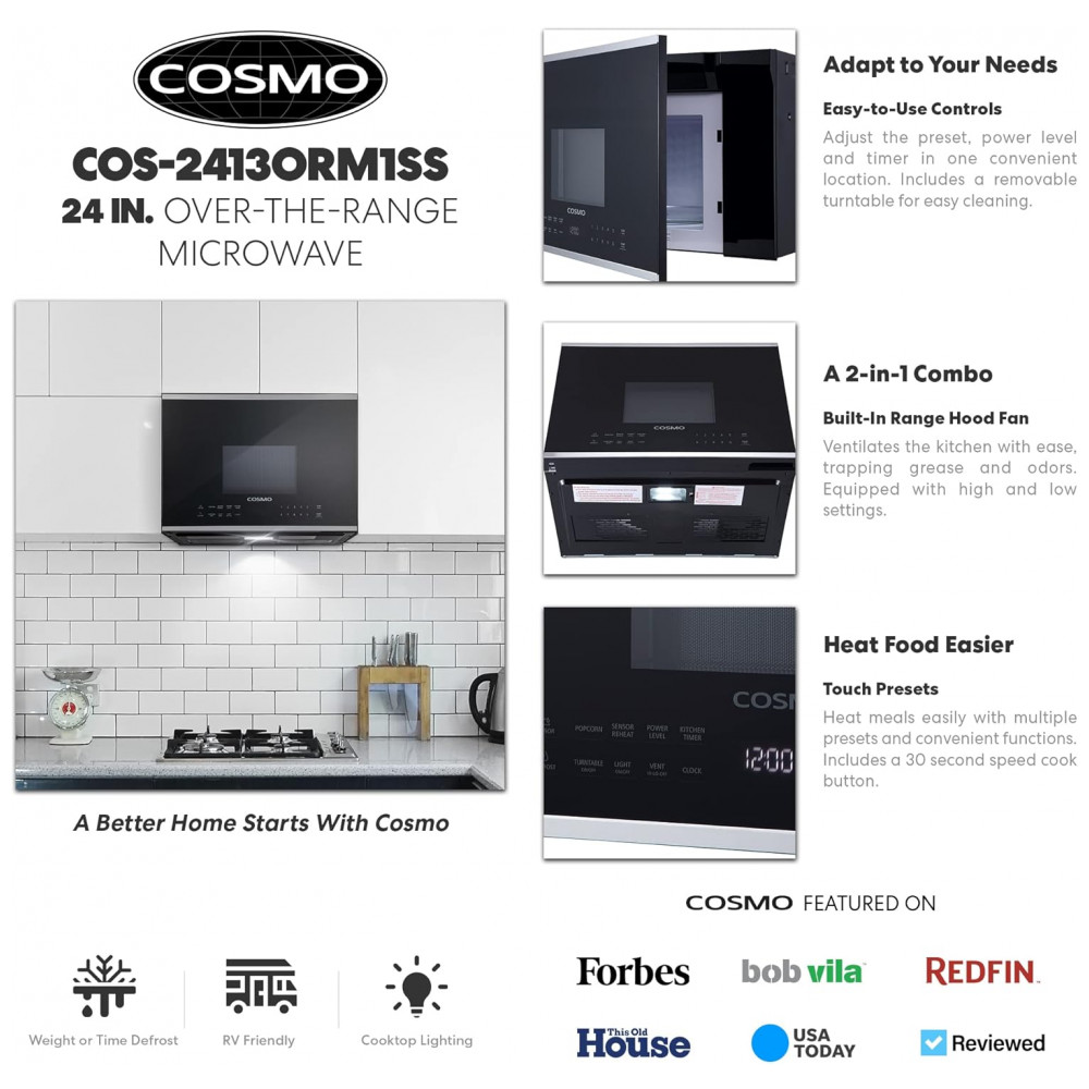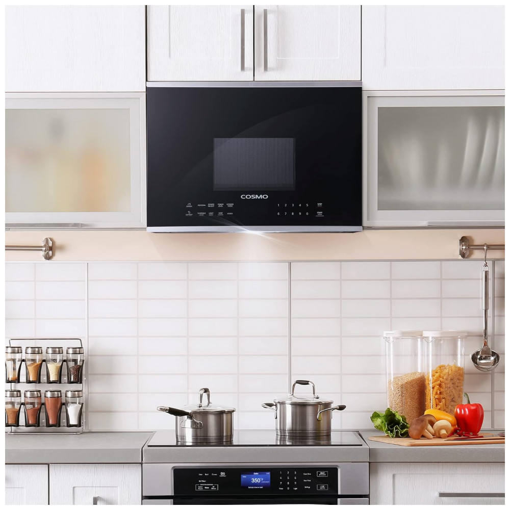O forno micro-ondas sobre fogão Cosmo com capacidade de 38 litros é indicado para instalação sobre fogão ou cooktop em cozinhas residenciais e ambientes compactos que necessitam de aquecimento e descongelamento de alimentos com ventilação integrada. A largura de 24 polegadas com acabamento em aço inox e frente em vidro preto favorece o uso em nichos reduzidos, mantendo capacidade interna adequada para pratos de refeição e recipientes próprios para micro-ondas.