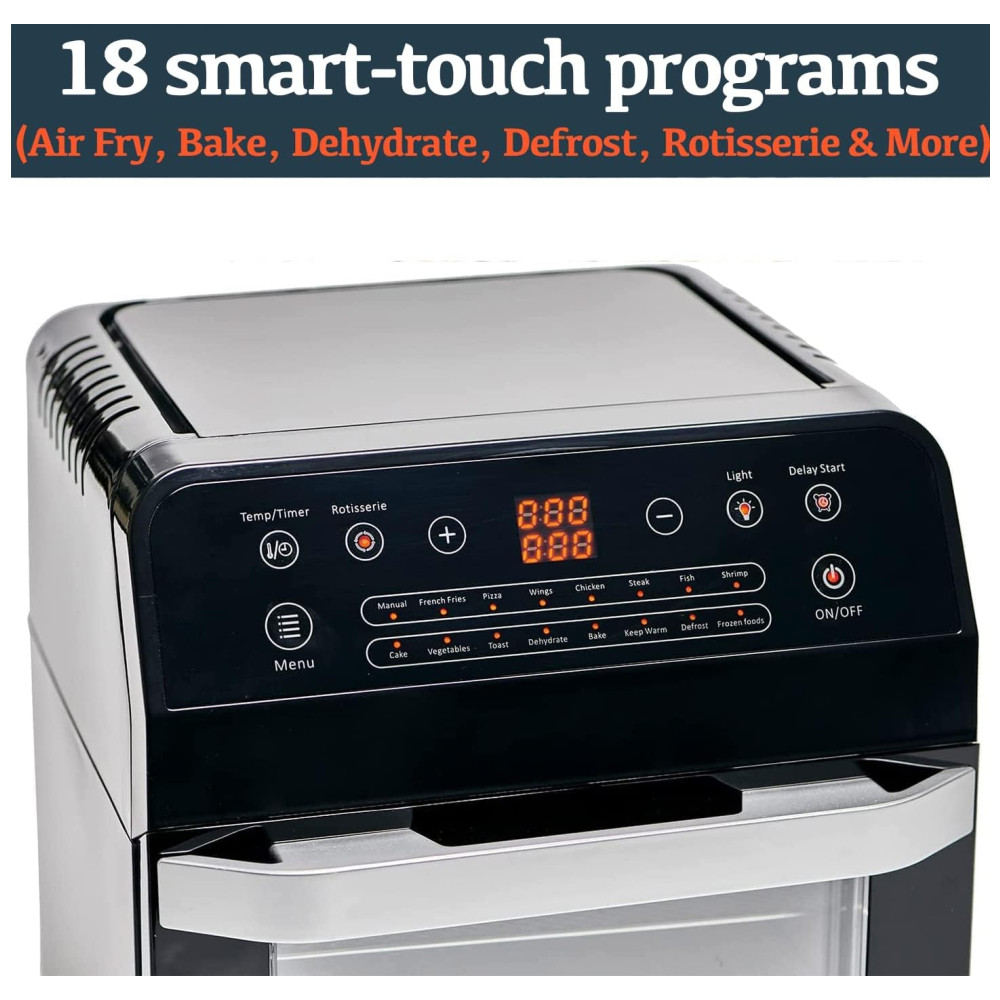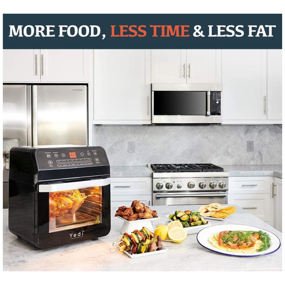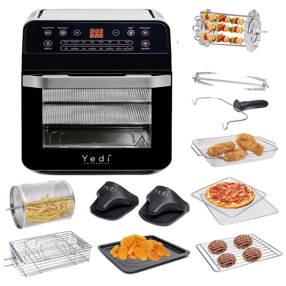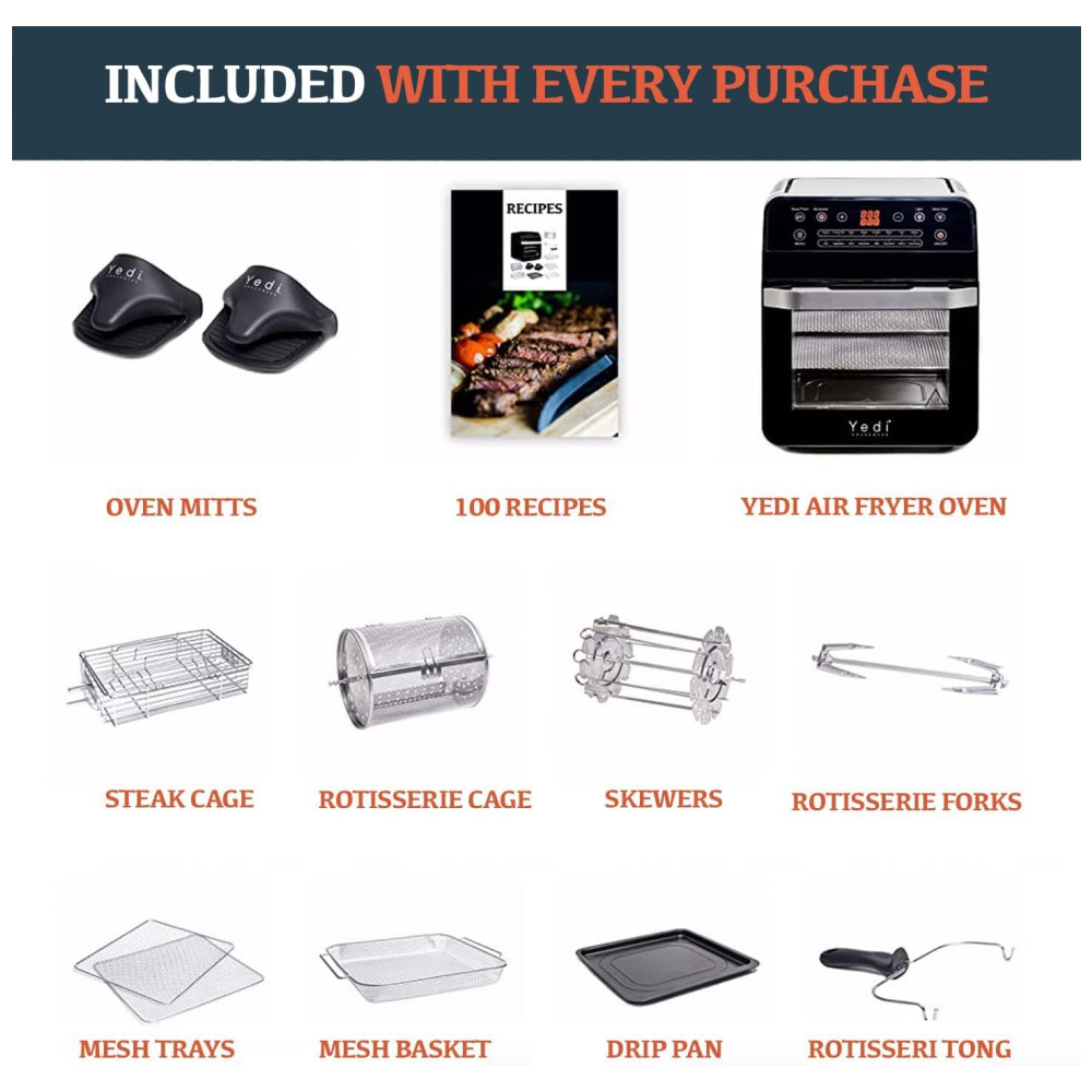 11 ACESSÓRIOS E LIVRO DE RECEITAS Vem com espeto rotativo, espeto rotativo, grelha para forno, pingadeira, espeto espeto, espeto rotativo, espeto espeto rotativo, espeto rotativo gaiola, cesto de malha rasa, duas bandejas de malha, luvas de forno Yedi e um livro de receitas Receitas Vegan e Keto incluídas