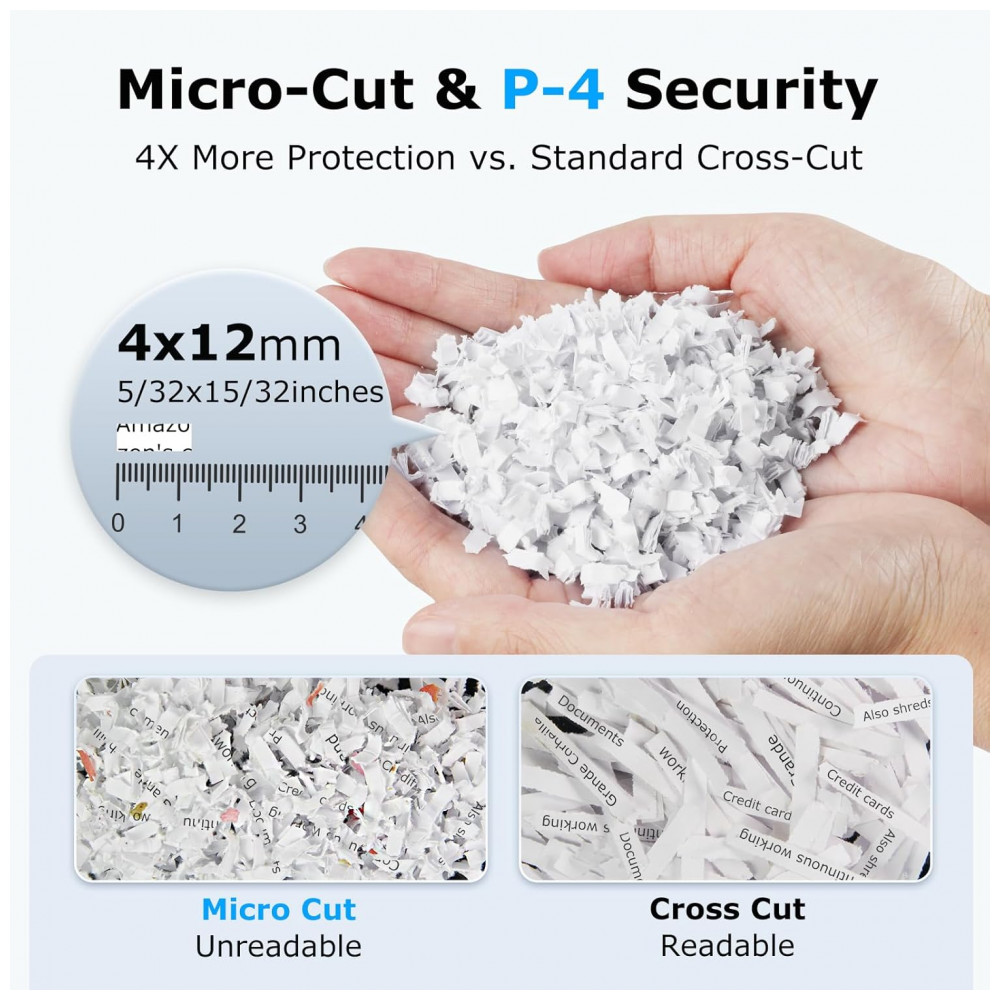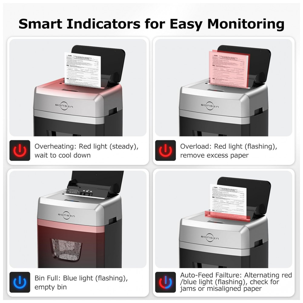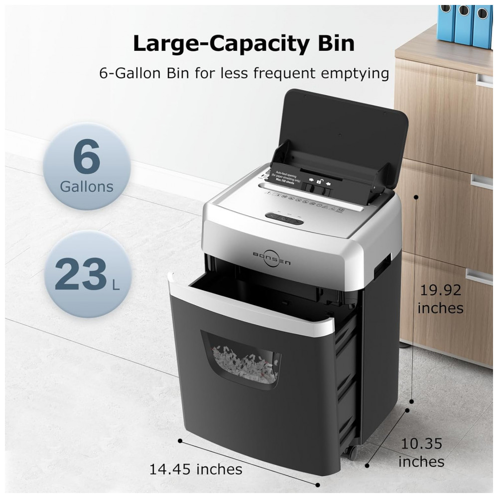 A Fragmentadora de Papel BONSEN oferece funcionalidade tanto automática quanto manual para 150 folhas, permitindo triturar papel, correspondências, cartões e grampos. Com capacidade de trituração contínua de 60 minutos e alto nível de segurança P4 com corte microcorte, transformando papel em pedaços minúsculos de 4 x 12 mm. Seu amplo recipiente de 3,79 litros reduz a frequência de esvaziamento, facilitando o transporte com rodízios universais de 360 graus. Importante: evite produtos em aerossol no triturador e não triture cartões de crédito metálicos.