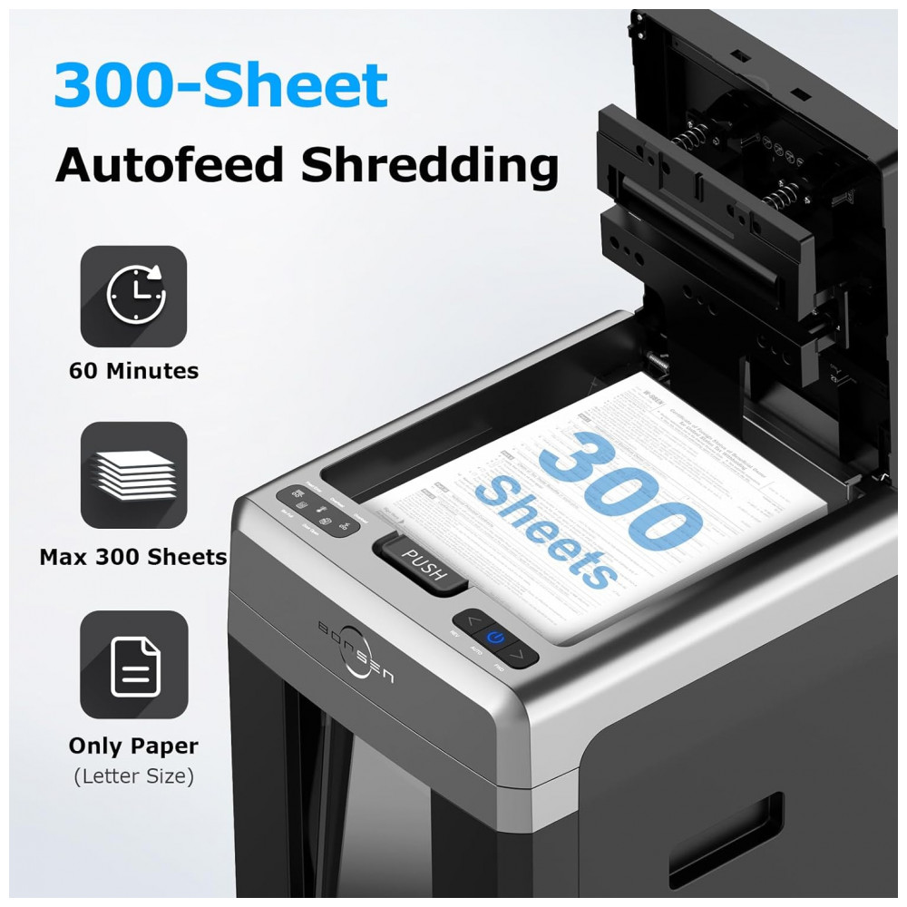 Desfrute de uma capacidade massiva de 300 folhas na Fragmentadora de Papel Automática BONSEN, triturando pilhas enormes de até 300 folhas automaticamente. Além disso, utilize a entrada manual para 12 folhas, grampos, clips, cartões de crédito e CDs/DVDs com facilidade. Com um tempo de operação contínuo de até 60 minutos no modo automático ou 30 minutos no modo manual, é ideal para uso intenso em escritórios. O corte microcorte ultra seguro produz fragmentos de confete de apenas 4 x 12 mm, garantindo máxima segurança de documentos. Funciona silenciosamente a 58 dB, ideal para ambientes compartilhados. O pacote com 50 folhas de lubrificante afia, limpa e lubrifica as lâminas da fragmentadora. Compatível com a maioria das marcas de fragmentadoras, é perfeito para uso em casa ou em escritórios.