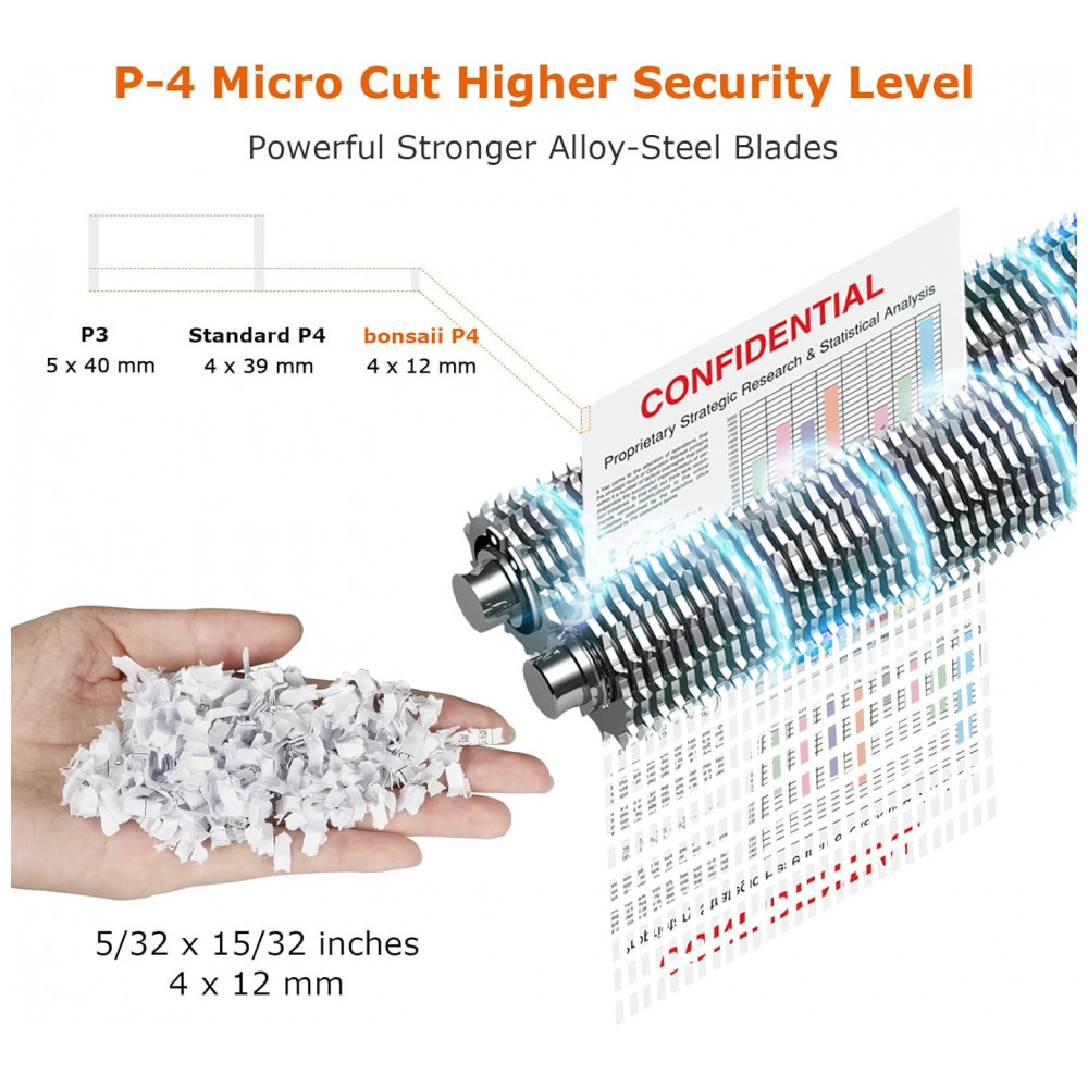 Com a Fragmentadora de Papel Bonsaii, você terá 60 minutos contínuos de funcionamento para destruir documentos confidenciais em casa ou no escritório. Seu sistema avançado de resfriamento e motor de alta eficiência garantem a operação sem interrupções. Este modelo de fragmentadora de papel microcorte profissional oferece nível de segurança superior ao P4, podendo destruir CDs, cartões de crédito, correspondências, grampos e clipes em partículas minúsculas de 5 x 12 mm, proporcionando máxima proteção às suas informações. Com velocidade de fragmentação opera de forma eficiente, evitando engasgos com a função de reversão e partida automática. Design personalizado com 4 rodízios universais para facilitar a movimentação, visor de lixo visível para verificar a capacidade do cesto a qualquer momento e proteção contra superaquecimento e sobrecarga para prolongar a vida útil do produto. A Fragmentadora de Papel Bonsaii é a escolha ideal para manter a segurança dos seus dados.