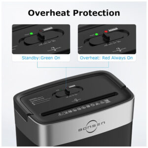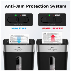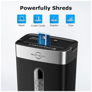 A Fragmentadora de Papel Bonsen é ideal para uso em casa e escritório, oferecendo tecnologia de corte cruzado que tritura 10 folhas por vez em partículas de 5×18 mm. Com capacidade para destruir papéis, grampos, cartões de crédito e clipes de papel com segurança de nível P4 para total confidencialidade. Projetada para uso doméstico, possui tempo de funcionamento de 4 minutos e 30 minutos de resfriamento. O cesto transparente de 15 litros e o design compacto a tornam eficiente e conveniente. A alça facilita a limpeza e a remoção de atolamentos, garantindo operação contínua e suave.