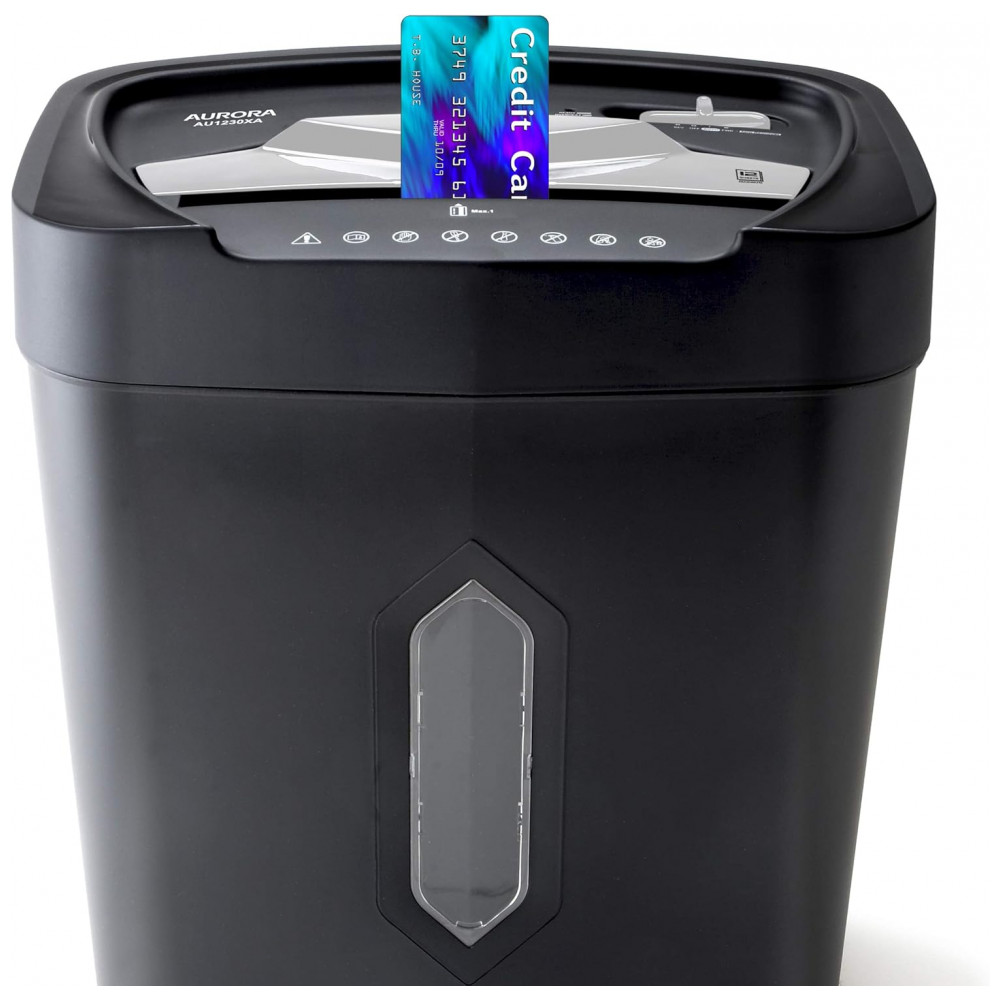 Corte transversal com capacidade para 12 folhas destrói cartões de crédito e pequenos clipes de papel