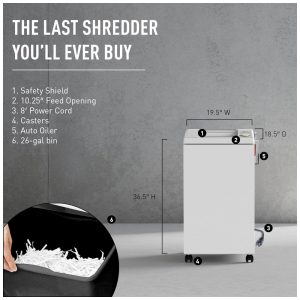 ALTA CAPACIDADE: Rasga de 23 a 25 folhas de papel por vez, com uma produção de 491 folhas por minuto, recipiente de fragmentação de 26 galões. Ideal. cria a melhor trituradora de papel resistente de uso duplo e trituradora de papel transversal.