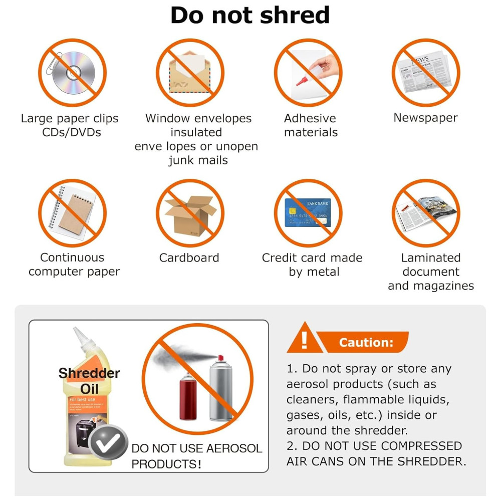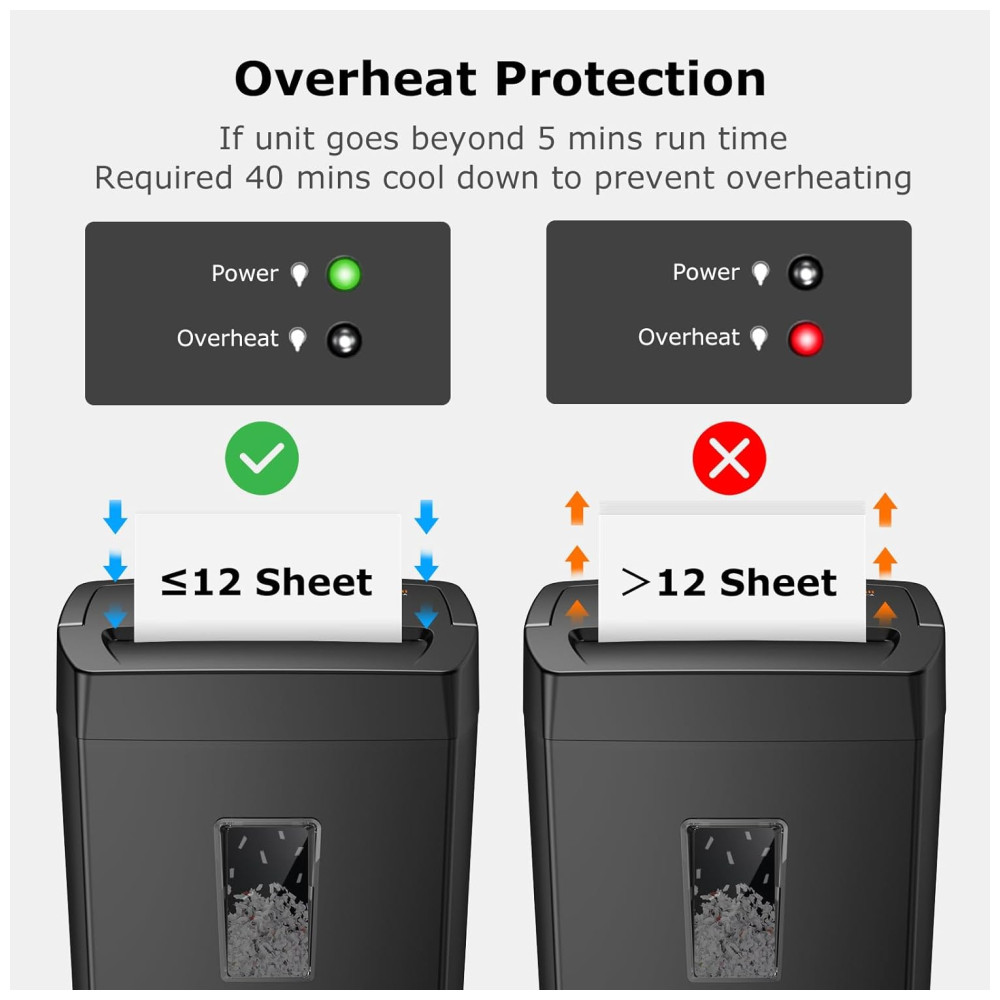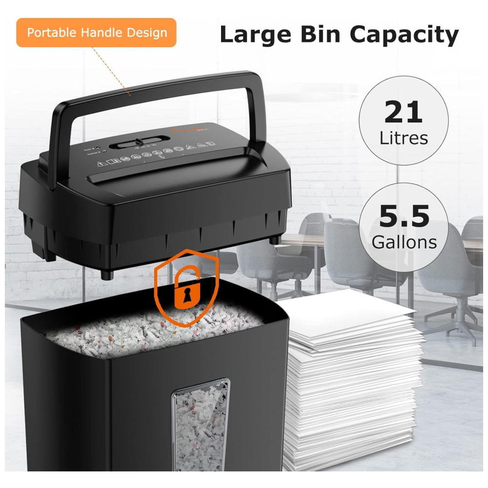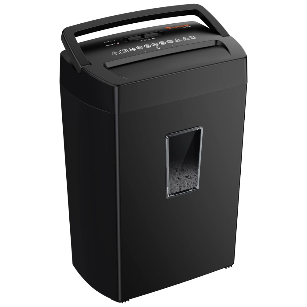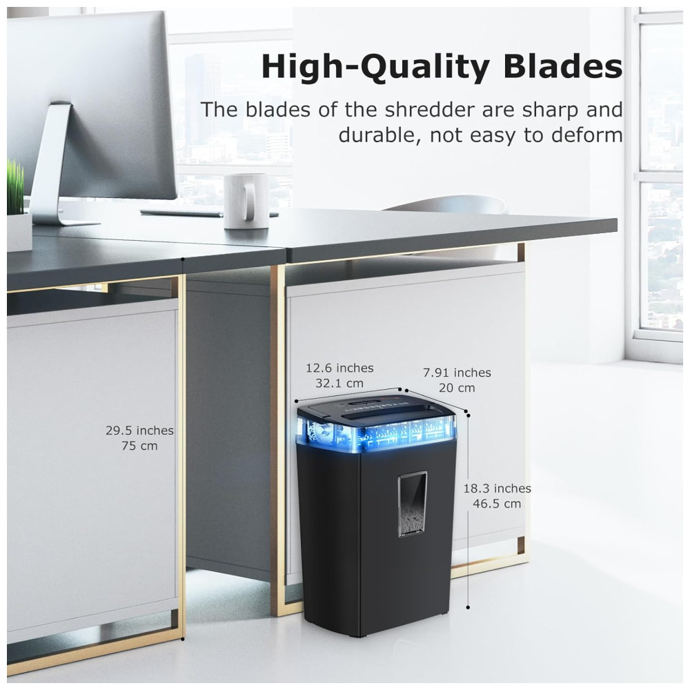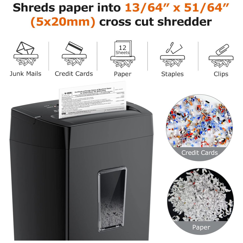O triturador de corte transversal para serviços pesados de escritório em casa pode lidar com 12 páginas de folhas sem esforço por passe, verifique se seus documentos importantes estão fragmentados com segurança, podem triturar papel, cartão de crédito, CDs, grampo ou clipes em partículas minúsculas de aproximadamente 5 x 20 milímetros.