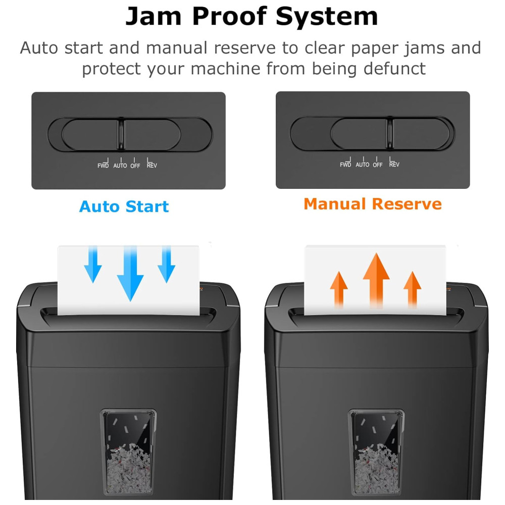 2 A função de partida , parada automática e de frente manual , reversa protegem o trabalho pesado do triturador de papel da frustração dos congestionamentos de papel. A proteção contra superaquecimento ajuda a usar triturador de papel sem se preocupar e prolongar sua vida útil. O triturador de documentos deixará de funcionar quando levantar a cabeça, mantendo o .