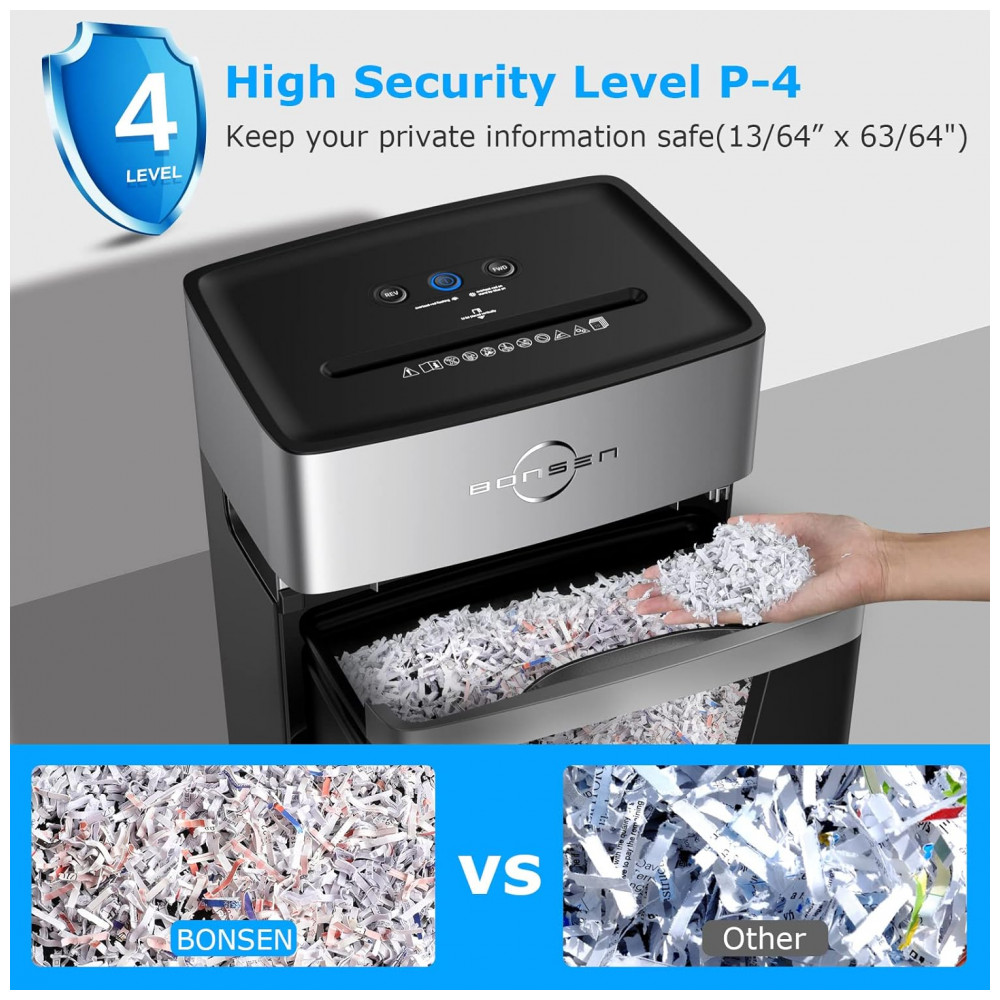 Capacidade de trituração de folhas 16 Este triturador de papel de corte transversal destrói 16 folhas por passagem em pequenas partículas de aproximadamente 3 x 2 centímetros, destrói CDs , correio eletrônico , cartões de crédito , grampos também. Alto nível de segurança P 4, evite efetivamente que suas informações confidenciais sejam vazadas.