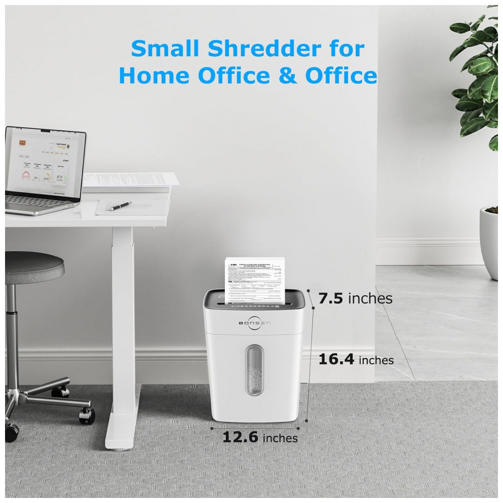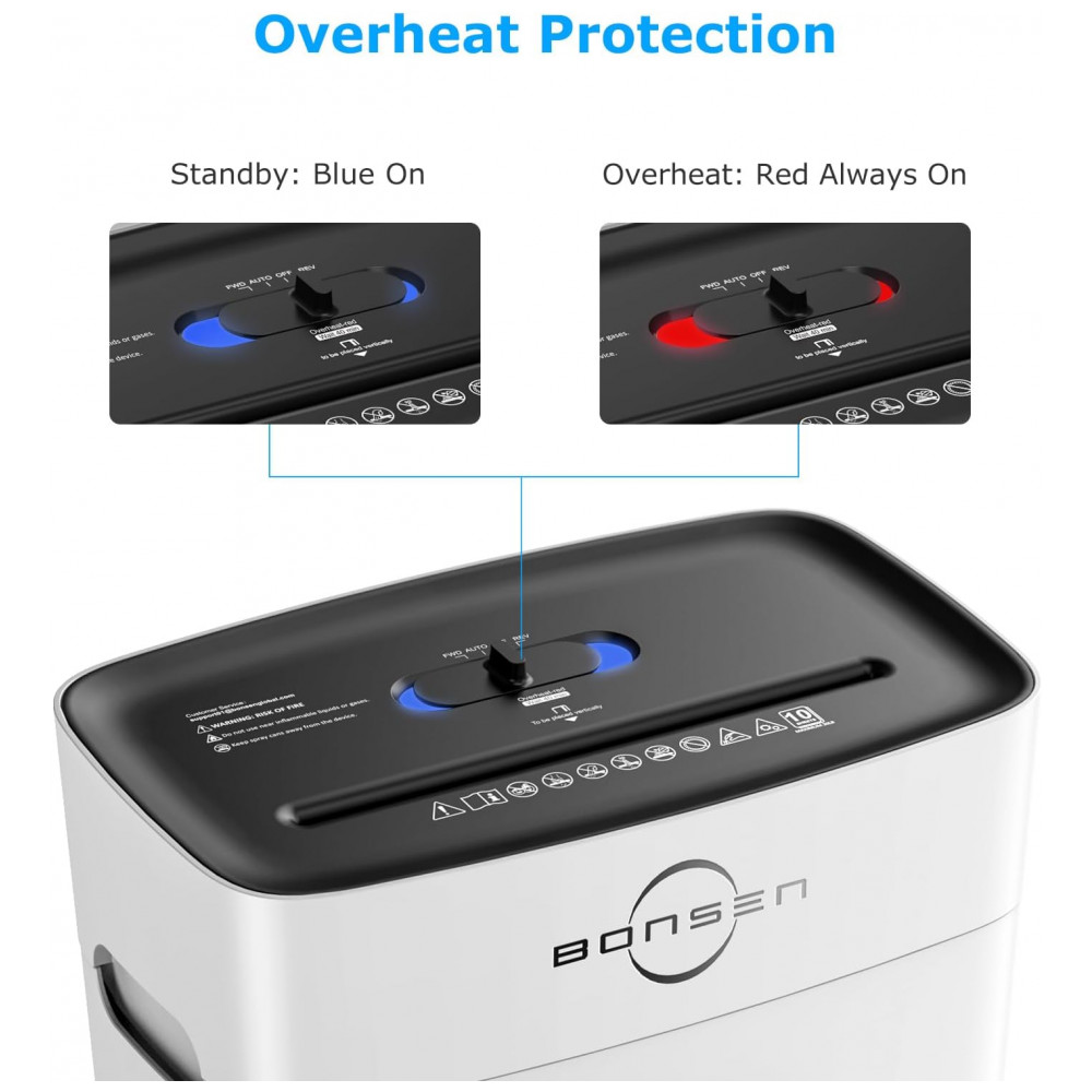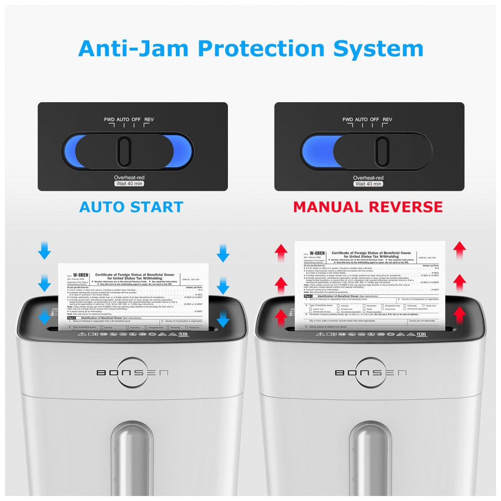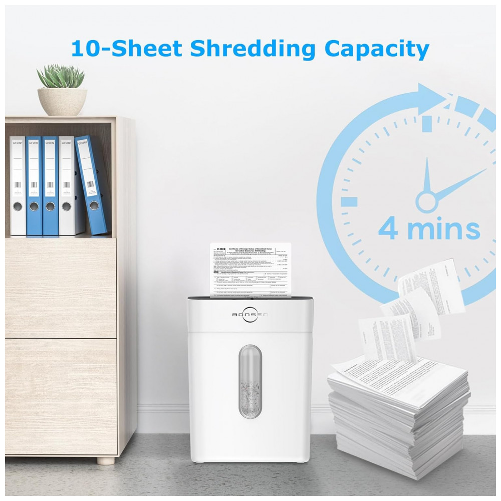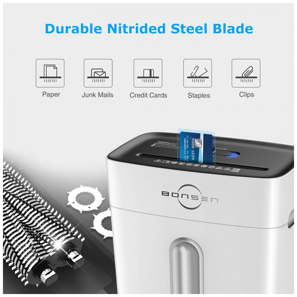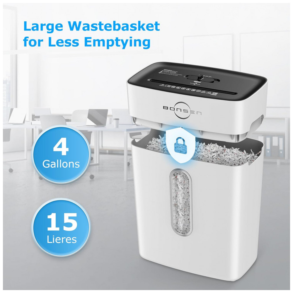 A fragmentadora de papel BONSEN de corte cruzado 10 folhas para casa fragmenta até 10 folhas de papel tamanho carta de 75g por vez, também fragmenta cartões de crédito plásticos um de cada vez, grampos, correspondências indesejadas e pequenos clipes de papel. Nível de segurança P4 alto. A fragmentadora BONSEN para escritório fragmenta o papel em pequenos pedaços de 5 x 18 mm, atendendo aos padrões de segurança nível P4, mantendo seus documentos confidenciais seguros. Tempo de funcionamento contínuo de 4 minutos. As fragmentadoras BONSEN para uso doméstico funcionam sem parar por até 4 minutos antes de ser necessário um período de resfriamento de 40 minutos. Proteção contra superaquecimento desliga automaticamente se exceder o tempo máximo de funcionamento. Cesto de 15 Litros para Menos Esvaziamento. O cesto grande de 15 litros pode conter 210 folhas de papel A4. A janela transparente em forma de pista de pouso facilita a verificação do status do cesto cheio. As fragmentadoras BONSEN para escritório em casa interromperão o funcionamento quando a cabeça estiver levantada ou o cesto estiver cheio. Operação Fácil e Proteção Segura. A fragmentadora de papel pequena BONSEN inclui com chave de controle de 4 modos: ALIM, AUTO, DESL, REV. Também indicadores de LED para ligado e superaquecimento. Sistema Anti-Atolamento. A função de reversão manual ajuda a desobstruir atolamentos de papel.