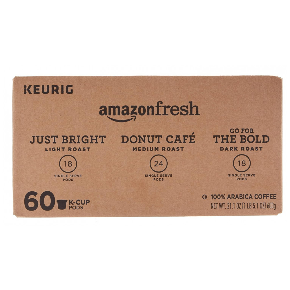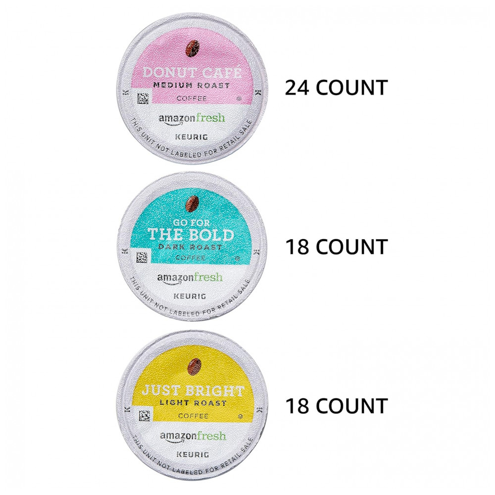 Contém 24 cápsulas de café torrado médio Donut Café, 18 cápsulas de café torrado Just Bright light e 18 cápsulas de café torrado escuro Go For The Bold