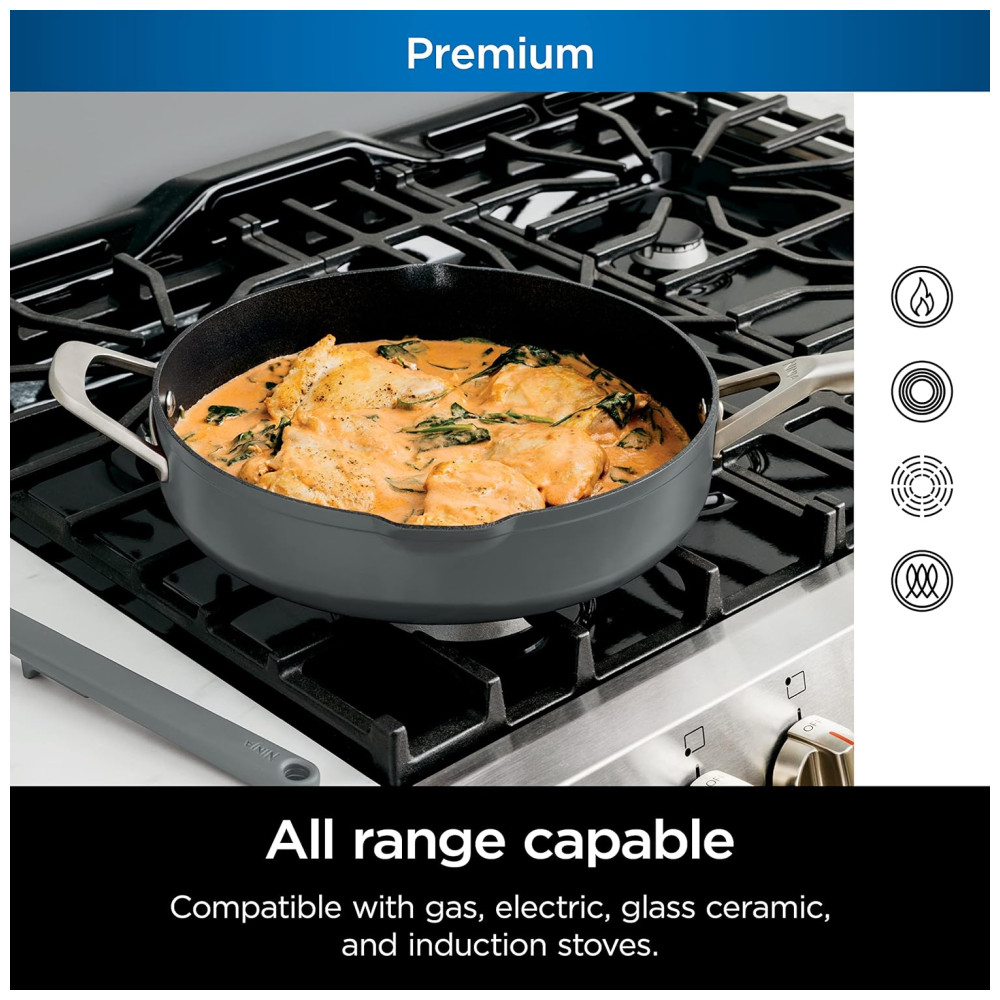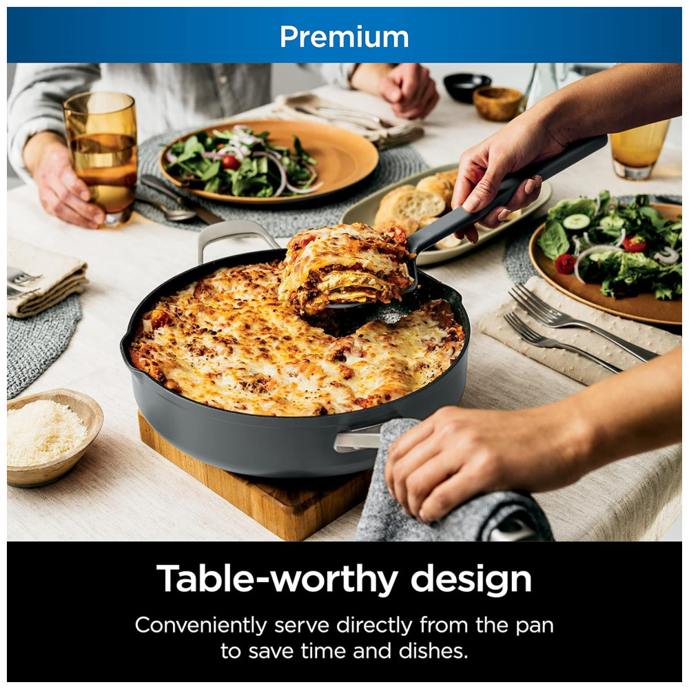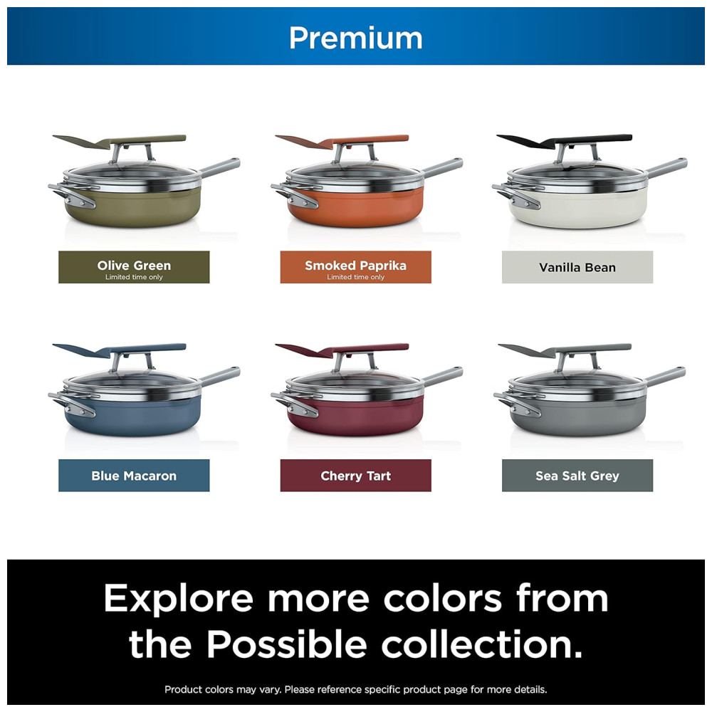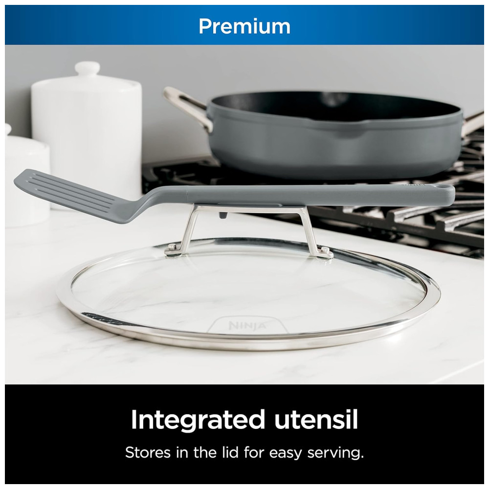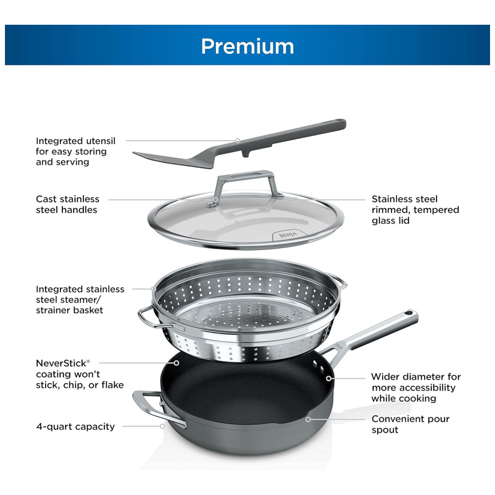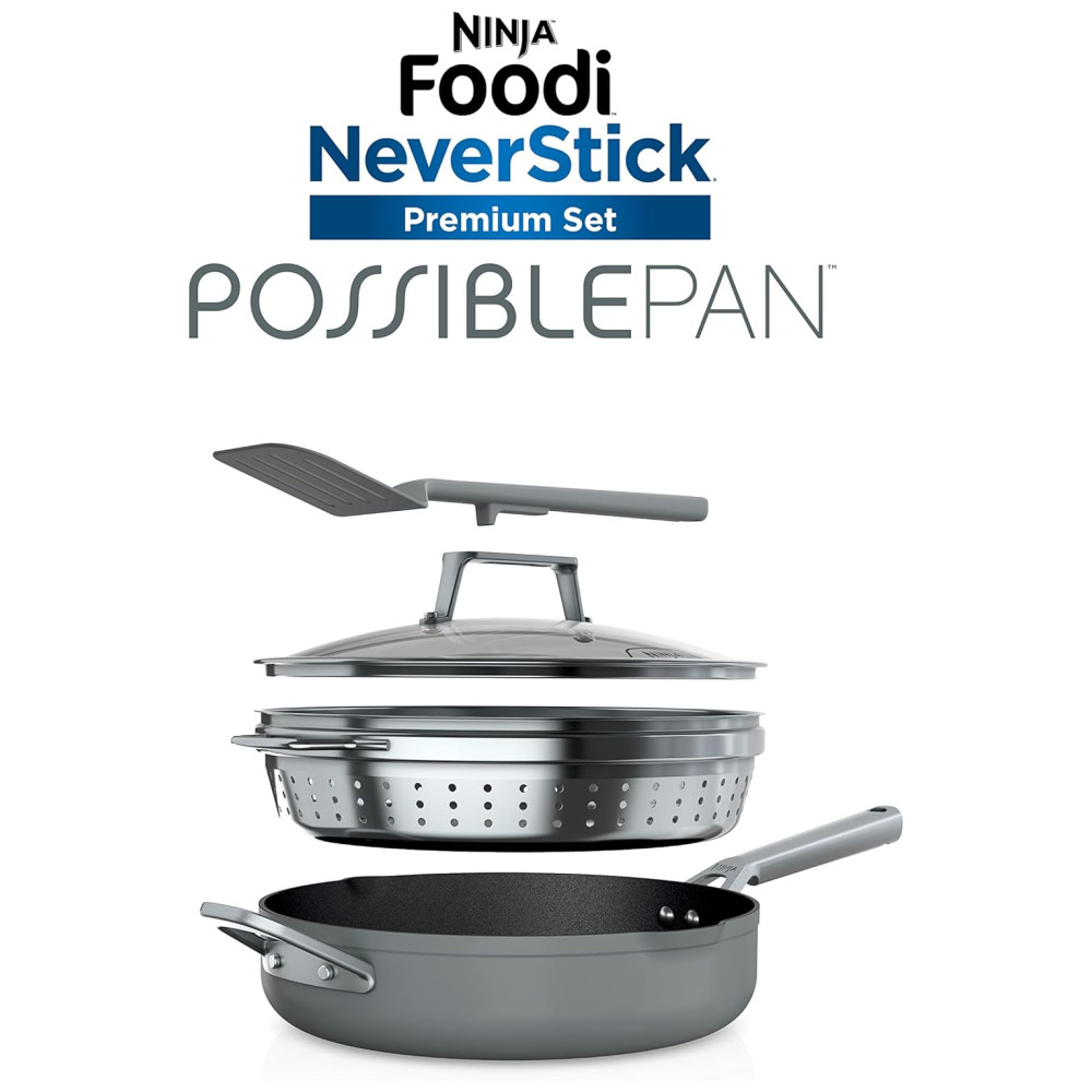 Conheça a incrível Ninja NeverStick PossiblePan! Esta panela de 4 litros com tampa é sua nova frigideira para tudo – substituindo uma frigideira de aço inoxidável, frigideira antiaderente, frigideira de saltear, frigideira, molheira, panela de molho, vaporizador, escorredor, espátula, frigideira de ferro fundido, assadeira e forma de assar.