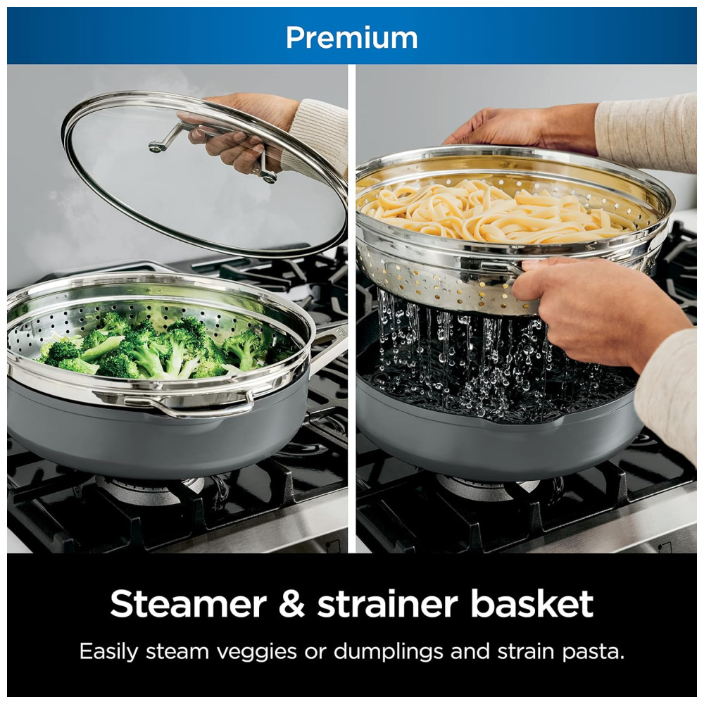 Além disso, possui um cesto de vapor de aço inoxidável integrado para legumes e bolinhos, ou levante a alça ergonômica e use os bicos de despejo convenientes para funcionar como um escorredor para massas.