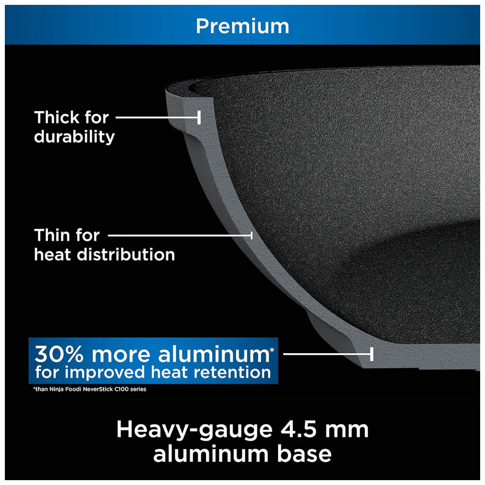 RETENÇÃO DE CALOR MELHORADA A base de alumínio de calibre pesado de 4, foi projetada para evitar pontos quentes e permitir uma distribuição de calor rápida e uniforme para resultados perfeitos sempre. Contém 30 mais alumínio do que a série Ninja Foodi NeverStick Essential C100