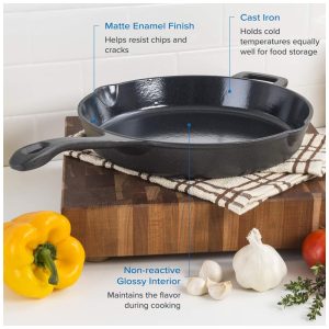 O interior de esmalte de carvão vegetal brilhante não reativo é naturalmente resistente à aderência e para utensílios de metal Exterior de esmalte fosco de carvão durável resiste a lascas e rachaduras e facilita a limpeza