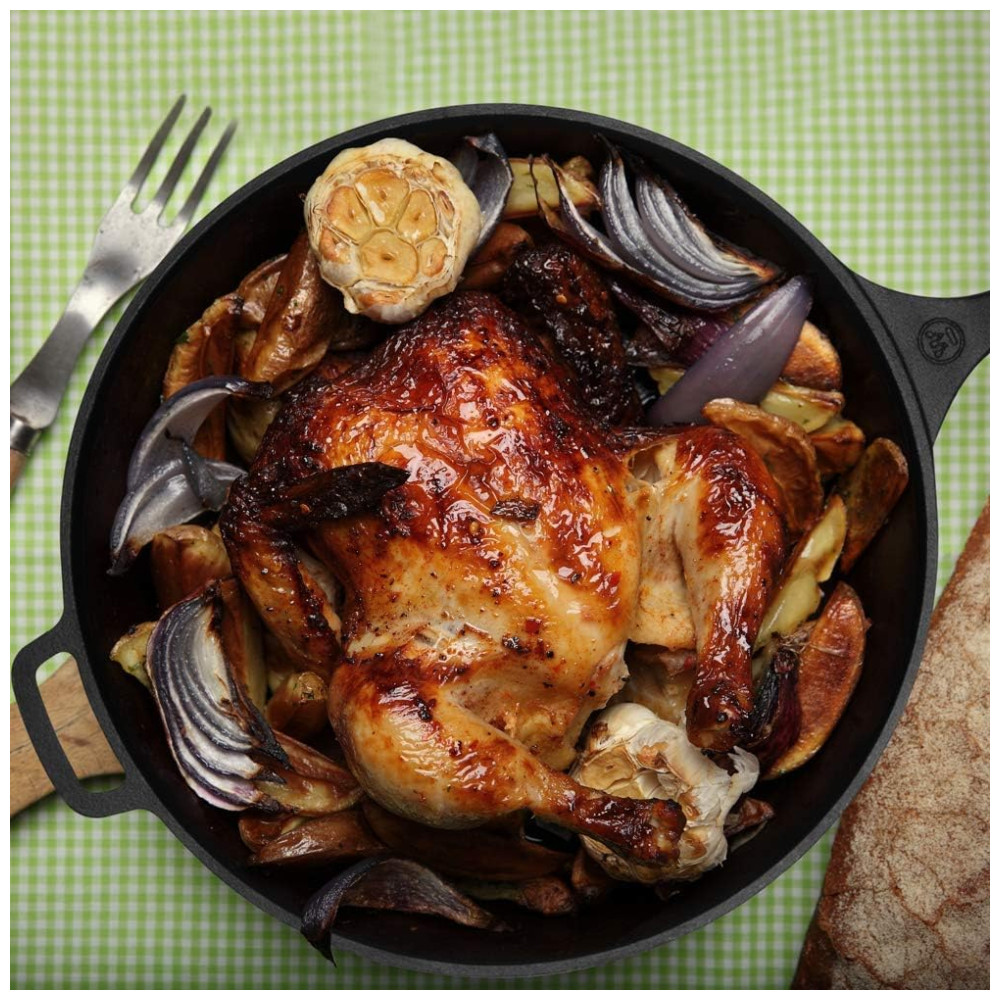 VERSATILIDADE Esta frigideira CHEF de ferro fundido de 15 polegadas pode ser usada no fogão, no forno, na grelha ou mesmo ao ar livre em uma fogueira. Grelhe, asse ou frite refeições deliciosas com esta frigideira de ferro fundido ou até mesmo use como travessa da cozinha à mesa.