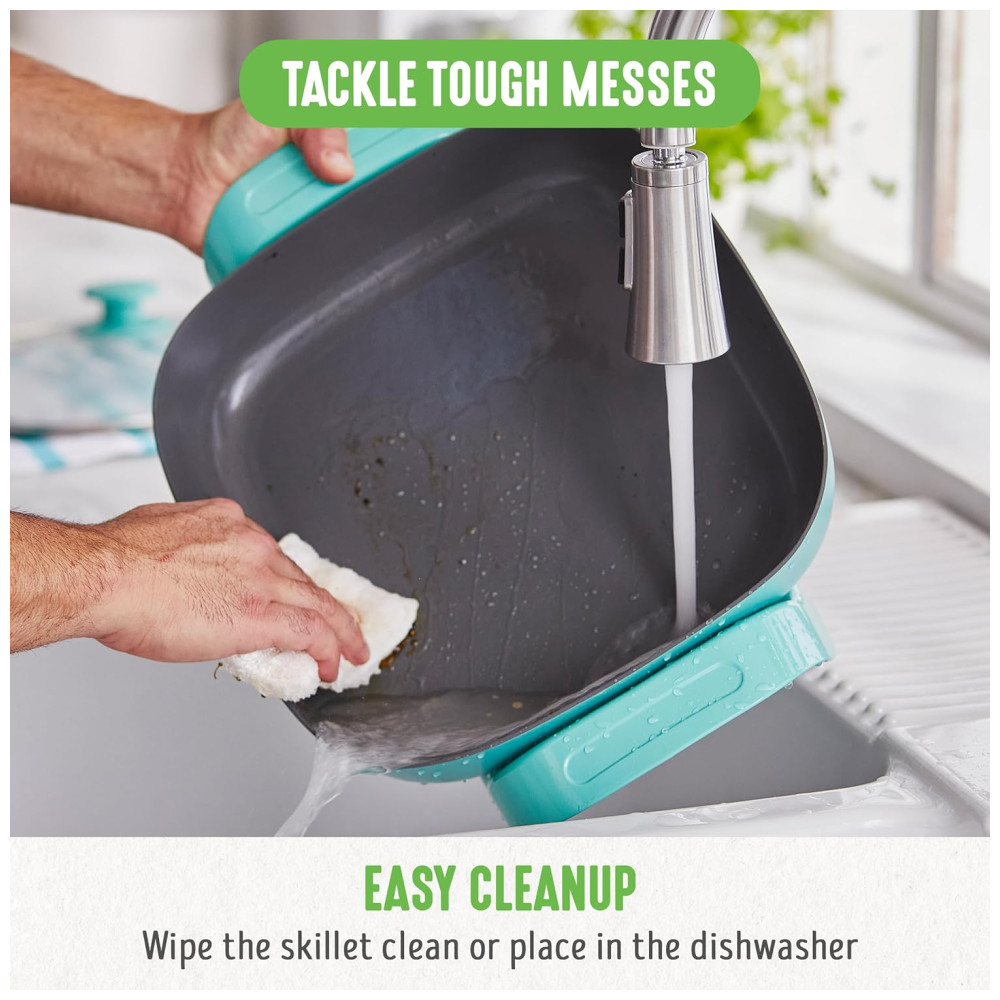 Nossa cobertura antiaderente de cerâmica, fácil de limpar, é derivada da areia e livre de PFAS, PFOA, chumbo e cádmio, garantindo que os alimentos não grudem e proporcionando uma limpeza rápida. O processo de cura do revestimento cerâmico emite 60% menos CO2 em comparação com os revestimentos antiaderentes tradicionais.