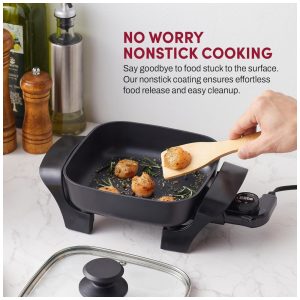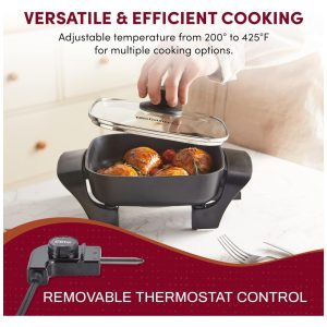 Aumente sua capacidade na cozinha sem precisar de reformas. Uma das opções mais versáteis e convenientes para sua cozinha é a Frigideira Elétrica Elite Gourmet. Prepare refeições completas em minutos, sele carnes antes de cozinhá-las e faça ovos em grande quantidade para sua família. A limpeza é fácil, já que a frigideira é totalmente imersível. Projetada para fácil uso e durabilidade, essa frigideira elétrica de 20 x 20 cm possui um seletor de temperatura variável de 93 a 204 graus Celsius, além de luz indicadora de energia. Com laterais altas de 5 cm e uma tampa de vidro, evita respingos enquanto você monitora o cozimento. Prepare refeições sem aquecer toda a cozinha, tornando-se um acessório econômico. Nossa frigideira elétrica de 600 watts é certificada pela ETL. Adquira já a sua e aumente a capacidade de preparo de sua cozinha. Trave sabores e umidade com a tampa de vidro temperado transparente. As dimensões da panela de 20 x 20 x 5 cm permitem fritar frango e preparar massas. A superfície antiaderente libera rapidamente os alimentos para uma limpeza rápida e sem complicações. Simplifique o tempo das refeições com nossa frigideira elétrica perfeitamente dimensionada. Desfrute de panquecas fofas, sanduíches gourmet e legumes refogados saborosos. Pode ser lavada na lava-louças para uma limpeza rápida e fácil. Corpo de alumínio fundido resistente com acabamento em preto que evita ferrugem ou deformação. Testada quanto à segurança, a frigideira elétrica de 600 watts e 110 volts listada pela ETL é ideal para uso doméstico, apresentando botão e alças com toque frio. Um presente essencial e atencioso para casa nova ou casamento.