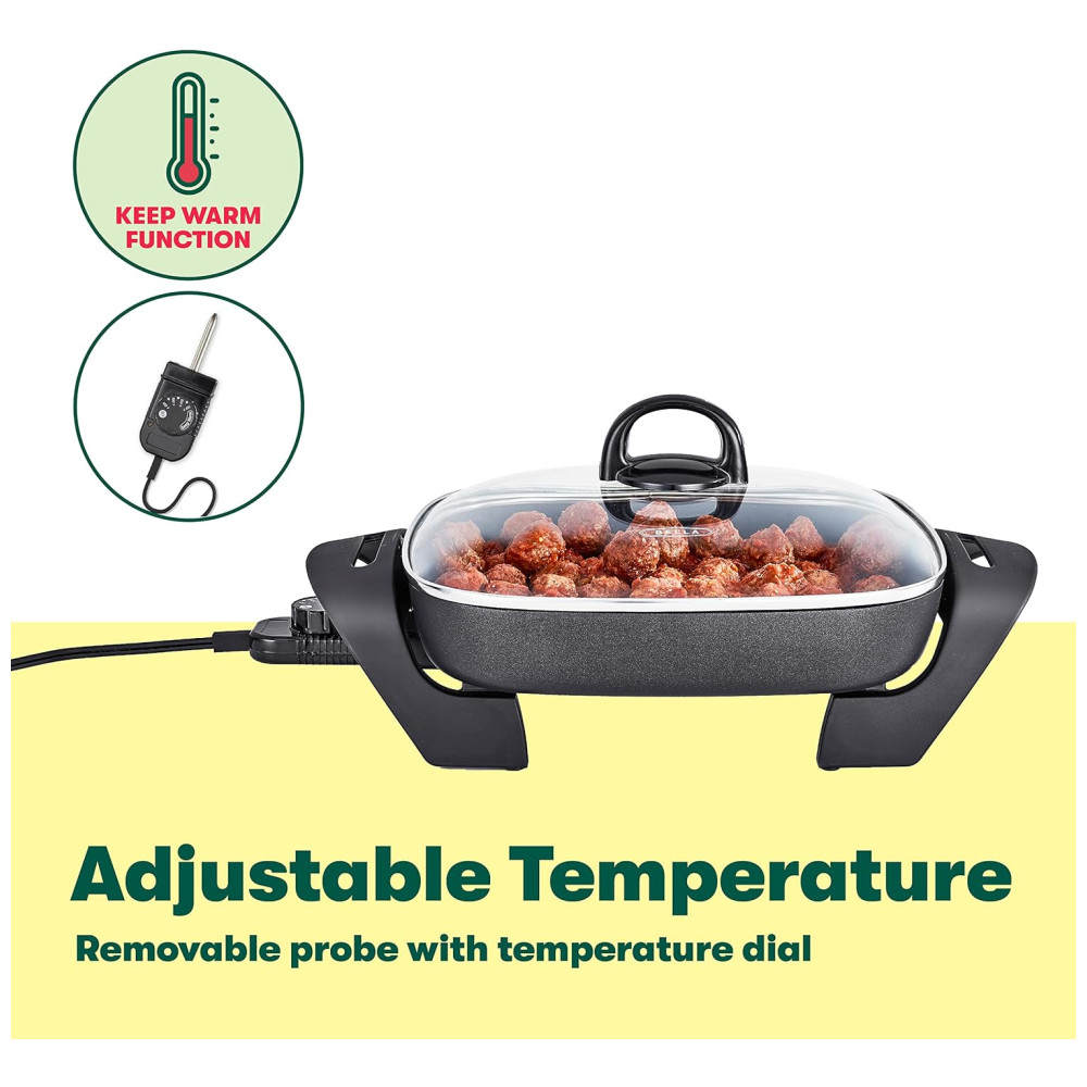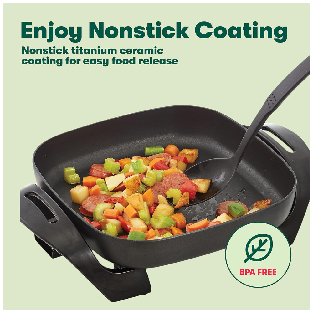 Dê adeus às suas panelas antigas e dê as boas-vindas à mais nova adição à sua cozinha: a frigideira elétrica com tampa da BELLA! Com revestimento cerâmico único e oito vezes mais durável, esta frigideira grande e funda de alumínio fundido tem uma base resistente e uma tampa de vidro temperado que pode ser lavada na lava-louças, tornando-a durável e fácil de limpar. As alças com toque frio evitam queimaduras, e o design totalmente imersível facilita ainda mais a limpeza. A construção de titânio reforçado garante uma resistência excepcional, durabilidade e resistência a riscos, mesmo com utensílios de metal. Além disso, esta incrível frigideira com tampa é livre de PTFE e PFOA, sendo segura para você e o meio ambiente. E para aqueles momentos em que precisar de mais precisão, a sonda removível com um botão de temperatura da frigideira elétrica permite ajustar o calor e criar refeições incríveis todos os dias. Com sua superfície grande e extra funda, nossa frigideira elétrica com tampa é perfeita para tudo, desde refeições em família até festas e bufês. COZINHA SEM ESTRESSES! Do café da manhã ao jantar e tudo mais, esta frigideira elétrica é um item essencial para qualquer cozinheiro. Com uma base durável de alumínio fundido e uma tampa de vidro temperado fácil de limpar, esta prática frigideira é perfeita para refeições em família ou convidados. PARA FAMÍLIAS Asse, frite, cozinhe no vapor ou use como um servidor de bufê… com a frigideira elétrica da BELLA, as possibilidades são infinitas! Seja preparando um prato favorito da família ou experimentando novas receitas, nossa frigideira grande pode fazer de tudo, como omeletes, risotos e muito mais. SUPER RESISTENTE Graças ao seu reforço de titânio premium, esta grande frigideira elétrica é ultra resistente e pode lidar até com os trabalhos de cozinha mais difíceis. Além disso, ela aquece 30% mais rápido do que as frigideiras regulares, e sua superfície resistente a riscos com certeza durará mais. TEMPERATURA AJUSTÁVEL Sem mais adivinhações ou comida queimada. Com nossas frigideiras elétricas, você sempre estará no controle. A sonda removível com botão de fácil utilização permite ajustar a temperatura com precisão para criar pratos deliciosos perfeitos toda vez. LIMPEZA FÁCIL Sem mais esfregar e raspar! A frigideira elétrica de cerâmica de titânio é totalmente imersível e pode ser simplesmente enxaguada com água morna e sabão. Por fim, a frigideira elétrica para cozinhar é livre de PTFE e PFOA, sendo saudável e segura para todos.