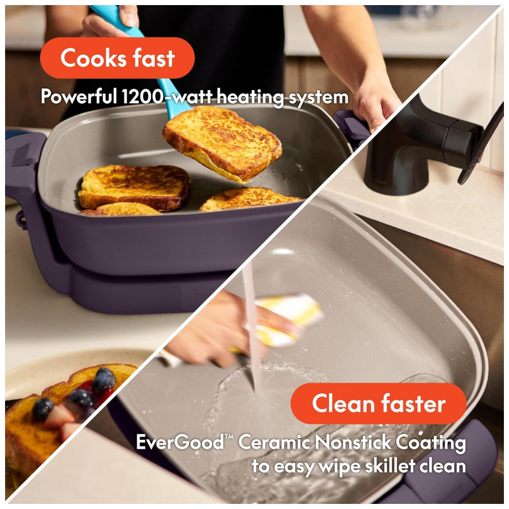 Chapa elétrica retangular em alumínio fundido com revestimento cerâmico antiaderente EverGood, projetada para preparo de refogados, grelhados, ensopados e pratos em uma única superfície aquecida. A área útil quadrada de cerca de 30 cm de lado e corpo profundo permite preparar porções familiares com distribuição uniforme de calor na base.