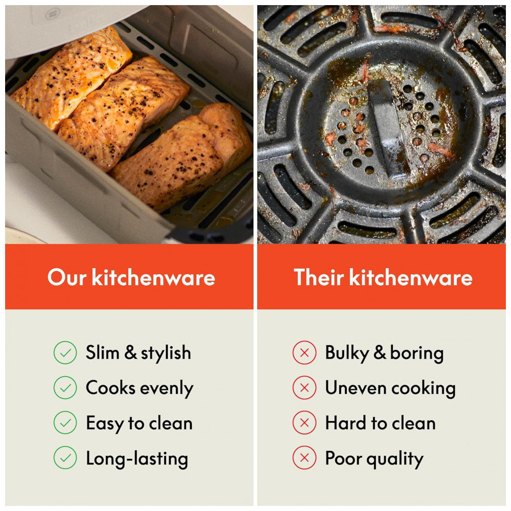 O conjunto integra tampa de vidro temperado com travas, controle de temperatura ajustável e alças frias ao toque para uso doméstico em bancada. O sistema Fits-anywhere possibilita armazenagem vertical com tampa invertida e trava, enquanto o cabo destacável e o interior antiaderente facilitam a limpeza após o uso.