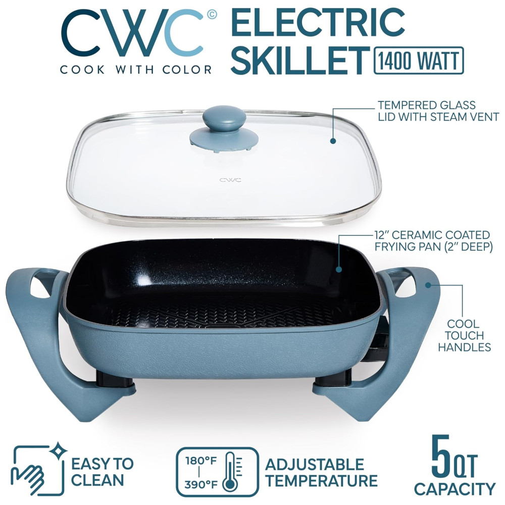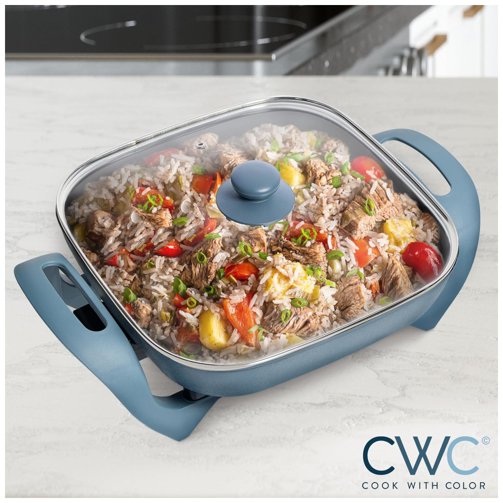 Apresentamos a Frigideira Elétrica COOK WITH COLOR, sua nova companheira de cozinha projetada para facilitar e aumentar a eficiência. Funcionando a 110V/60Hz com um potente elemento de aquecimento de 1400W, esta frigideira garante um aquecimento rápido e uniforme para todas as suas criações culinárias. Com uma ampla frigideira , ideal para preparar refeições grandes para a família ou convidados. A tampa de vidro transparente permite fácil monitoramento, travando sabores e umidade para resultados consistentemente deliciosos. Graças ao seu design avançado, a frigideira opera com baixo ruído e vibração, enquanto o furo de ventilação integrado libera o excesso de calor, mantendo condições de cocção ideais e estendendo a vida útil do eletrodoméstico. A Frigideira Elétrica COOK WITH COLOR oferece limpeza e manutenção sem esforço com sua superfície antiaderente revestida de cerâmica livre de PFOA. Basta limpar a superfície com um pano úmido ou lavar com uma esponja para uma limpeza completa. Seja em casa ou em um restaurante, esta frigideira é valorizada por sua versatilidade e funcionalidade avançada. Atualize sua cozinha com a Frigideira Elétrica COOK WITH COLOR e desfrute da conveniência e eficiência que ela traz para suas receitas. Potente e Eficiente Operando a 120V60Hz e apresentando um robusto elemento de aquecimento de 1400W, garantindo aquecimento rápido e uniforme para todas as suas necessidades culinárias. Espaçosa e Durável Apresenta uma ampla frigideira de alumínio fundido, com revestimento cerâmico, oferecendo durabilidade, distribuição de calor uniforme e espaço amplo para refeições grandes. Monitoramento Fácil e Manuseio Seguro Possui uma tampa de vidro temperado para monitoramento conveniente sem a necessidade de retirar a tampa, preservando calor e umidade. Os botões e alças CoolTouch garantem uso seguro e confortável. Controle de Temperatura Preciso Inclui luz indicadora de ligar/desligar e um termostato removível com ajustes de temperatura variável. Ajuste facilmente o calor para um controle preciso na cocção e obtenha resultados perfeitos, evitando a supercocção. Fácil de Usar e Limpar A superfície antiaderente revestida de cerâmica é livre de PFAS para uma culinária mais saudável e limpeza fácil. Basta limpar a superfície com um pano úmido ou lavar com uma esponja para uma limpeza completa.