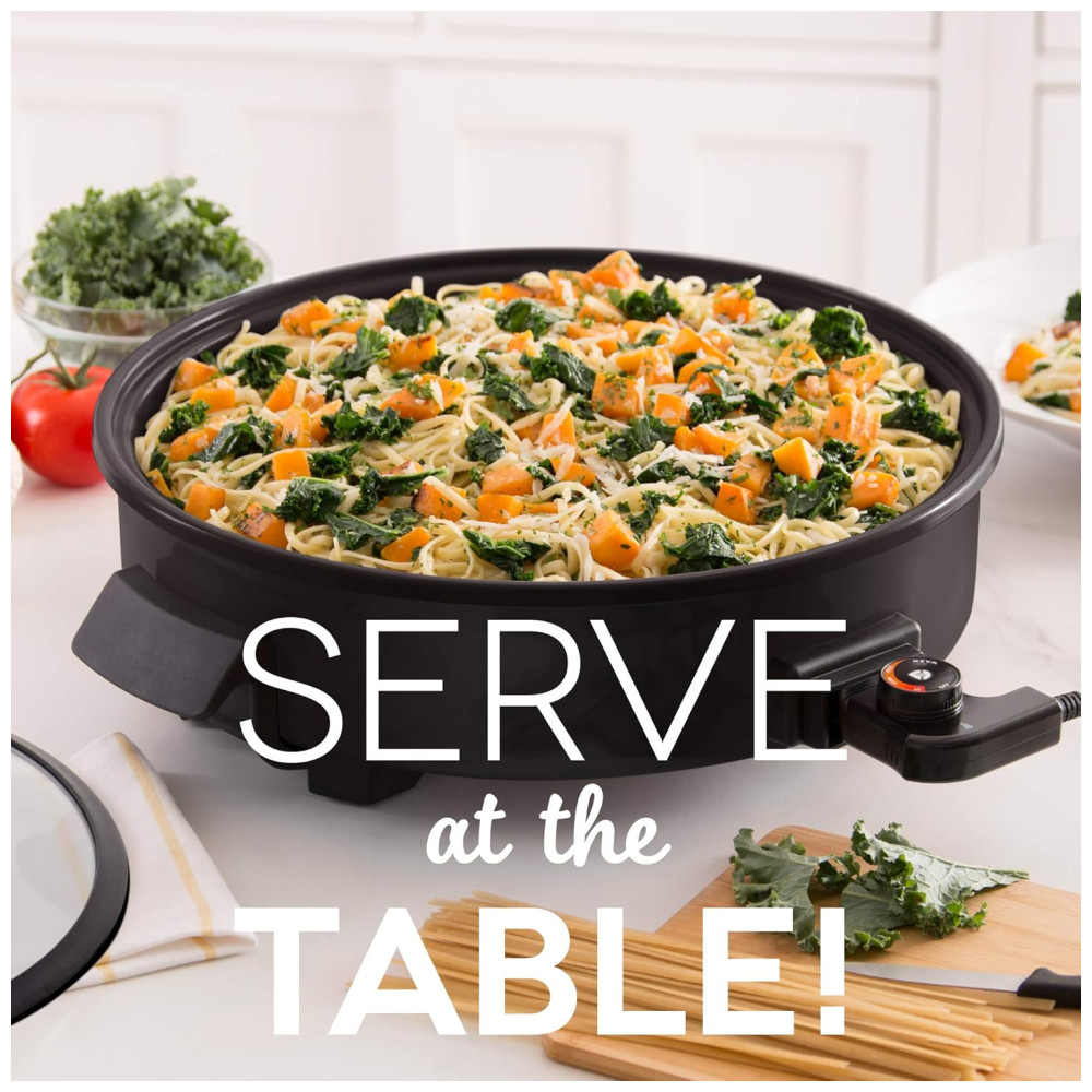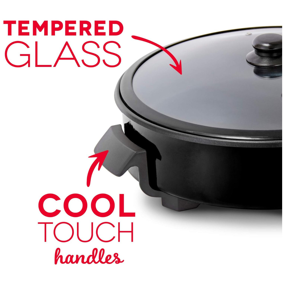 A Frigideira Familiar Dash, é perfeita para cozinhar e entreter na bancada. Com uma ampla superfície 6,35 cm de profundidade, acomoda ensopados, molhos, fritadas e muito mais para uma família de até 6 pessoas. Refogue, cozinhe em fogo baixo, mexa, sele e refogue, tudo na sua frigideira Dash. A superfície de cozimento antiaderente sem gordura facilita a limpeza, e a sonda elétrica removível e o cabo facilitam o armazenamento. Um controle de temperatura fácil de usar ajusta a frigideira para até 232 graus rapidamente, e as alças frias ao toque permitem transportar com segurança da cozinha para a mesa. COM GRANDE CAPACIDADE DE 20 XÍCARAS, 14 polegadas de superfície de cozimento e 6,35 cm de profundidade proporcionam até 20 xícaras de capacidade de cozimento, alimentando aproximadamente 6 pessoas. Perfeito para famílias grandes ou entreter em festas – seja hambúrgueres, panquecas, pizza, stir fry, fajitas e muito mais, esta frigideira tem tudo o que você precisa. AQUECIMENTO RÁPIDO – Cozinhe ou asse, do café da manhã ao jantar, sobremesas ou uma variedade de lanches para atender até aos paladares mais exigentes. Aquece rapidamente até 232 graus em menos tempo do que levaria para aquecer o fogão ou o forno. TAMPA DE VIDRO TEMPERADO – Permite verificar com segurança as refeições durante o cozimento, enquanto o selamento adequado conserva o calor e o sabor, para que você possa servir ótimas refeições toda vez. SEGURANÇA – A superfície antiaderente TruGlide livre de PFOA proporciona um cozimento uniforme para resultados consistentes e facilita a limpeza. A alça fria ao toque permite manuseio seguro durante e após o uso, transferindo facilmente as refeições da cozinha para a mesa com segurança.