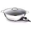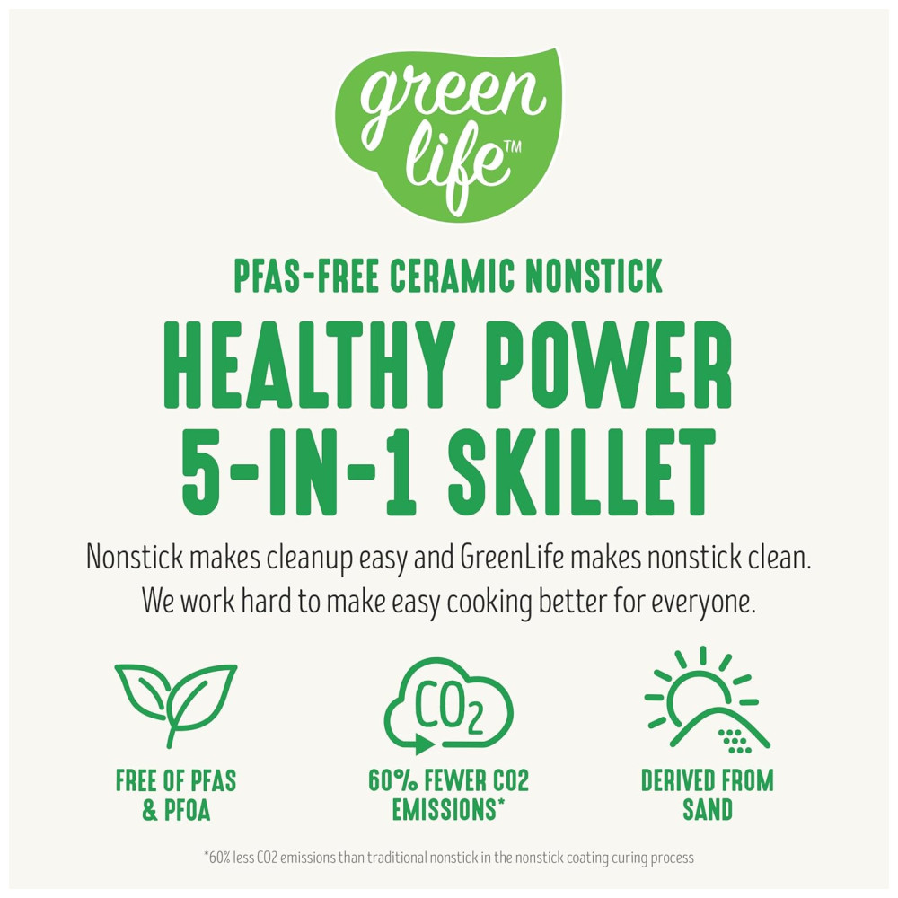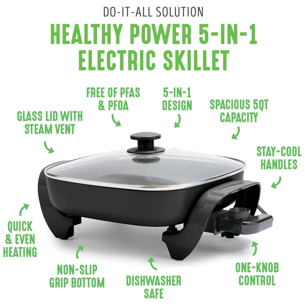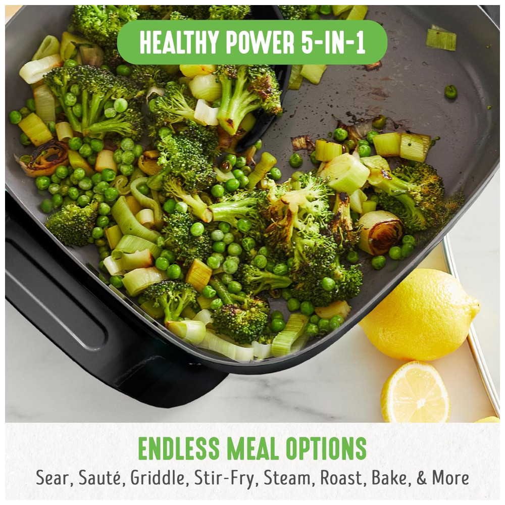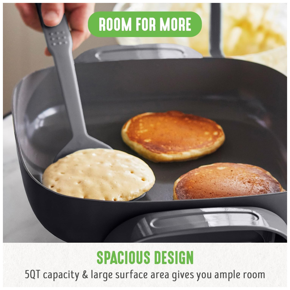 Se você procura por uma cozinha completa que pode ser apenas conectada, não procure mais. Com a Frigideira Elétrica 5 em 1 GreenLife, você pode fritar, refogar, assar, grelhar, cozinhar no vapor e muito mais. Nosso revestimento antiaderente cerâmico saudável foi especialmente projetado para aparelhos de cozinha, proporcionando um desempenho antiaderente ideal. Além disso, nosso revestimento é livre de PFAS, PFOA, chumbo e cádmio, permitindo que você cozinhe de forma mais saudável. Com capacidade de 4,7 Litros e área de superfície de 30,48 x 30,48 cm, você tem espaço suficiente para porções grandes que toda a família pode desfrutar, desde grandes lotes de panquecas e ovos de manhã até deliciosas lasanhas e filés de frango à noite. O controle de um botão permite ajustar a temperatura desejada para resultados perfeitos, enquanto os cabos frios ao toque e a base antiderrapante mantêm você confortável e no controle. Além disso, a tampa de vidro temperado mantém o calor, a umidade e o sabor enquanto você acompanha o progresso das refeições. Basta limpar a frigideira quando terminar ou colocá-la na lava-louças para sujeiras difíceis. Não perca a chance de ter uma cozinha saudável e funcional com a GreenLife!