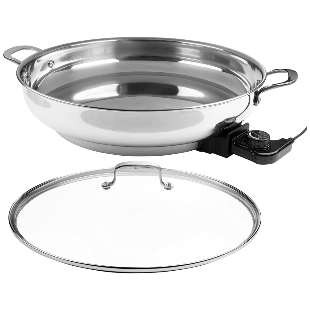 Seja para refogar, grelhar ou fazer uma omelete delicada, a Frigideira Elétrica da CucinaPro será seu eletrodoméstico de cozinha preferido. Cozinhando rapidamente e de forma uniforme, você não precisará passar tanto tempo na cozinha e seus resultados serão ainda melhores. Fabricada em aço inoxidável polido 1810, esta elegante frigideira elétrica certamente será uma favorita. A frigideira grande é facilmente grande o suficiente para cozinhar comida para uma família de quatro pessoas. Tamanho extra grande de 16 polegadas. O interior aquece de forma uniforme e cozinhará suas refeições rapidamente. A Frigideira CucinaPro vem com uma sonda de temperatura, que oferece total controle sobre o processo de cozimento e ajuda a garantir que as refeições fiquem perfeitas. A tampa de vidro temperado retém o calor e permite que você veja dentro da frigideira enquanto a comida está cozinhando, facilitando o acompanhamento do progresso. A Frigideira Elétrica CucinaPro possui alças rebitadas firmemente fixadas que a tornam muito segura de usar. A frigideira pode ser lavada à mão ou limpa com um pano úmido. Sempre tenha cuidado perto de superfícies quentes.