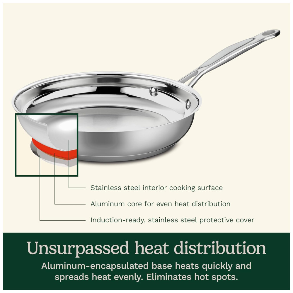 A frigideira Cuisinart Chefs de 10 polegadas 25 cm foi inspirada nas cozinhas da França e é feita de aço inoxidável 1810 de qualidade profissional, que não reage com alimentos ácidos.