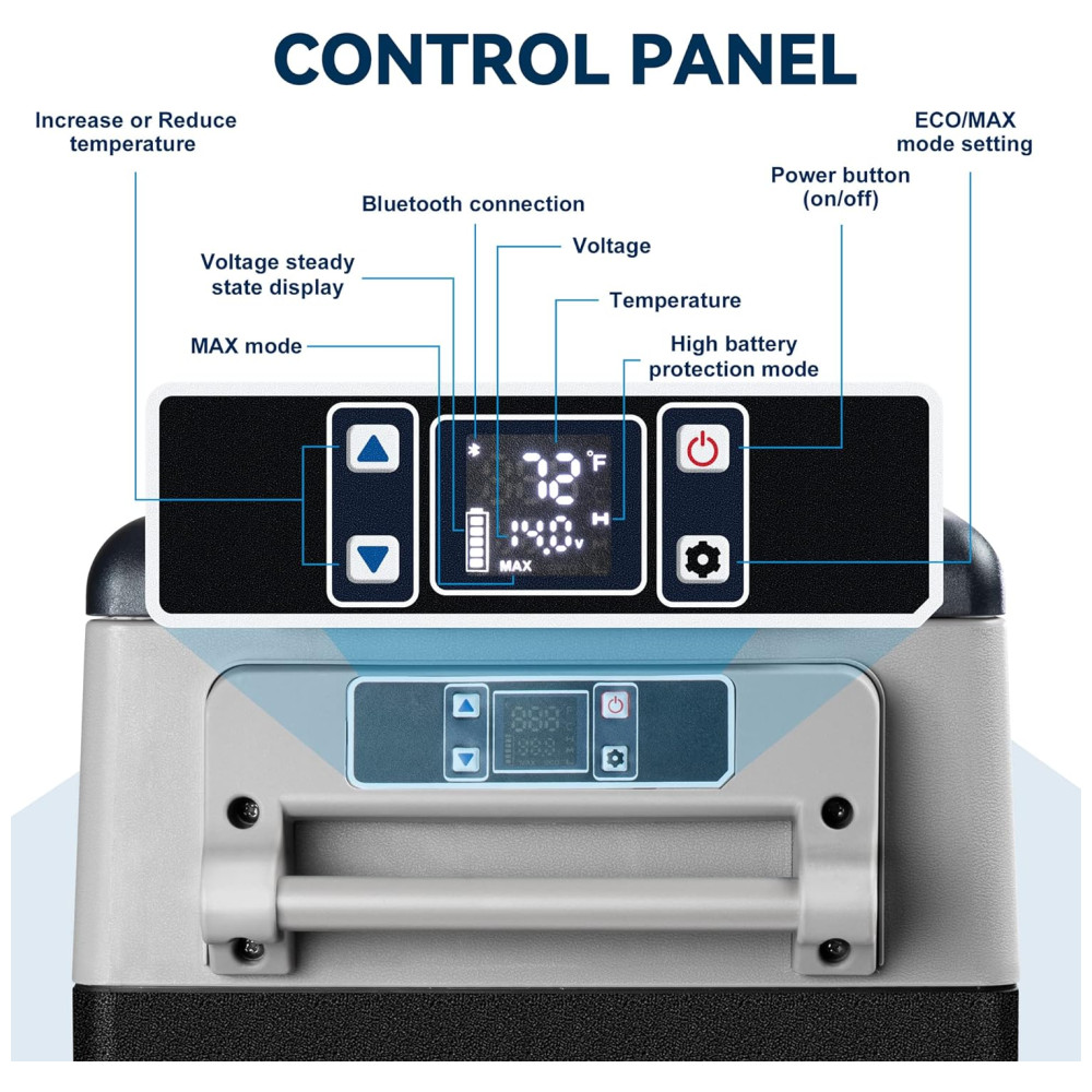 PAINEL LCD E CONEXÃO DE BLUETOOTH O painel LCD permite ver diretamente o funcionamento do refrigerador 12v para carro e ajustar a faixa de temperatura a qualquer momento