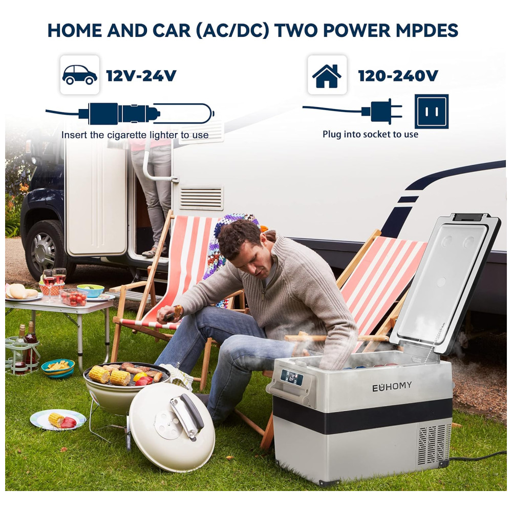 PROTEÇÃO DE BATERIA INTELIGENTE E USO DUPLO EM CASA , CARRO O refrigerador de carro 12v da Euhomy está equipado com adaptadores 120 , 240V AC e 12 , 24V DC, que podem ser s em casa ou no carro. O refrigerador RV oferece três funções de proteção de bateria baixa, média e alta em diferentes níveis. Este projeto pode evitar que a fonte de alimentação do carro fique sobrecarregada ou em curto circuito, então você não precisa se preocupar em ficar sem energia ao usar a geladeira de 12 volts. Tudo isso para você aproveitar a viagem.