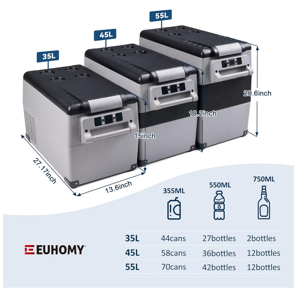 DUPLA ÁREA DE ZENAMENTO E POTENTE CAPACIDADE O refrigerador de carro Euhomy está equipado com duas zonas, divididas em zona de refrigerador de 8L e zona de freezer de 37L. As áreas de zenamento duplas podem reduzir o odor. O freezer portátil da geladeira permite que você zene uma variedade de alimentos enquanto os mantém frescos. Este poderoso refrigerador rv pode conter 46cans de cola, ou 28 garrafas de água ou 15 garrafas de vinho tinto, que atende totalmente RV1 , motoristas de caminhão, proprietários de barcos e campistas para zenar frutos do mar, lanches, carnes e bebidas, viagens, passeios de barco e necessidades de acampamento.