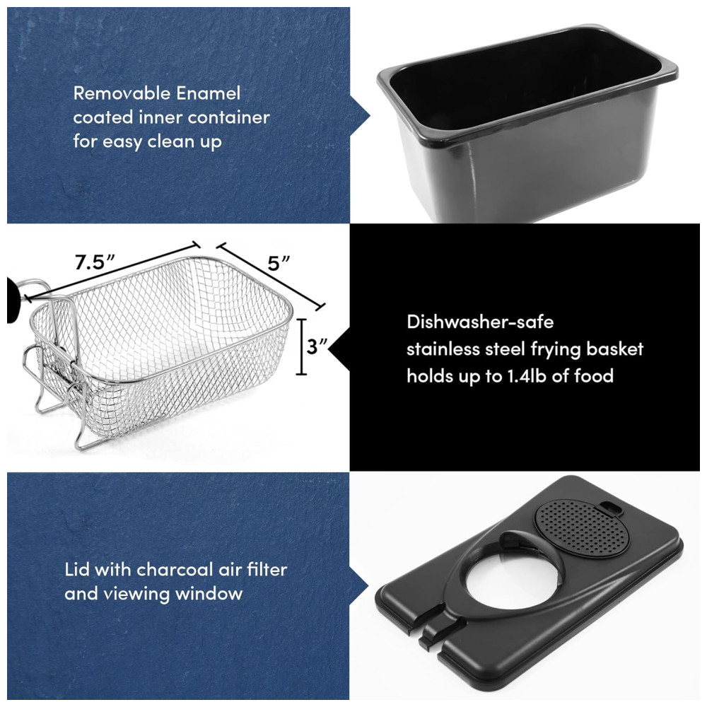 A tampa conveniente com filtro de odor substituível e janela de visualização evita respingos ou derramamentos de óleo quente, permitindo que você acompanhe o processo de fritura com segurança.