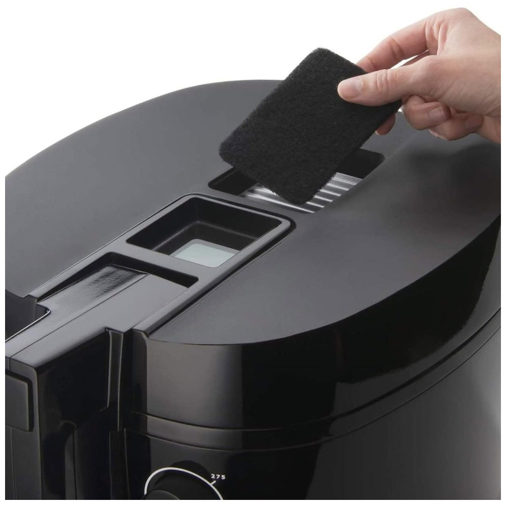 Filtro de Carvão Ativado: Absorve os odores da fritura, mantendo sua cozinha mais agradável. A alça externa do cesto permite baixar os alimentos no óleo com a tampa fechada, prevenindo respingos.