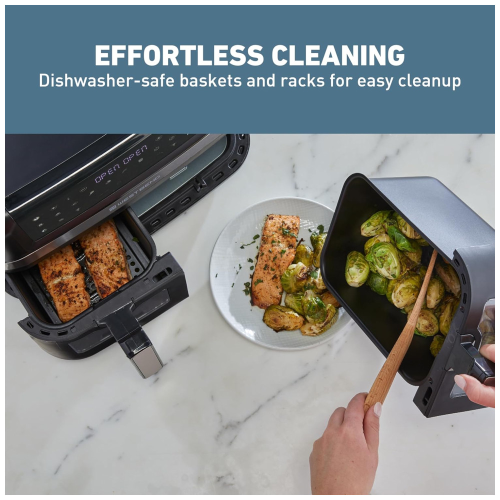 QUINZE PREDEFINIÇÕES DE COZIMENTO: Esta air fryer de 9,46 litros com cesta dupla possui configurações de tempo com um toque para Air Fry, Assar, Grelhar, Frango, Desidratar, Peixe, Batatas Fritas, Congelados, Manter Aquecido, Pré-aquecer, Tostar, Reaquecer, Cozinhar Duplo, Sincronizar Finalização e Vegetais.