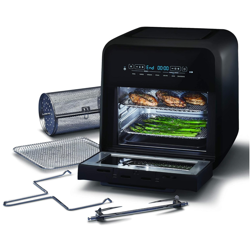 Acessórios Incluídos: O forno de bancada vem com uma cesta de air fryer de malha de 3,3 litros, 3 grades de fluxo de ar para circulação de 360 graus, um espeto para usar como forno de rotisserie e um garfo para manuseio de rotisserie.