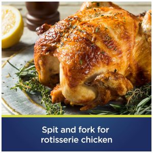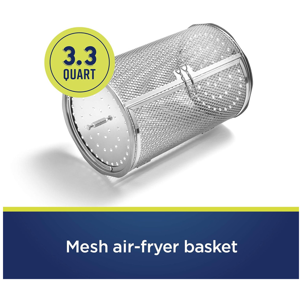 Componentes Incluídos: Cesta de air fryer de malha de 3,3 litros, 3 grades de fluxo de ar para circulação de 360 graus, espeto para rotisserie e garfo de manuseio para rotisserie.