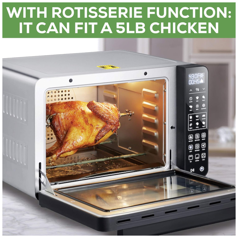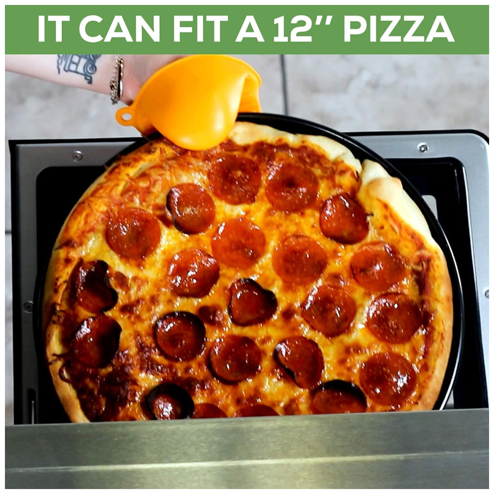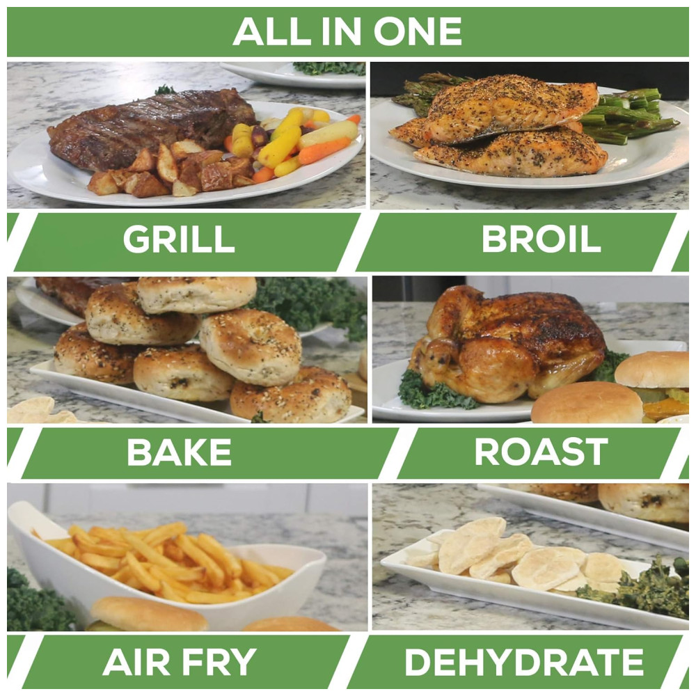 Com 12 funções pré-programadas, você pode air fry, assar, tostar, grelhar, desidratar, preparar pizza, frango, kebabs, e muito mais. Este forno é um verdadeiro equipamento multifuncional que também funciona como forno de pizza, torradeira, forno rotisserie, forno de convecção, grelha interna e micro-ondas.