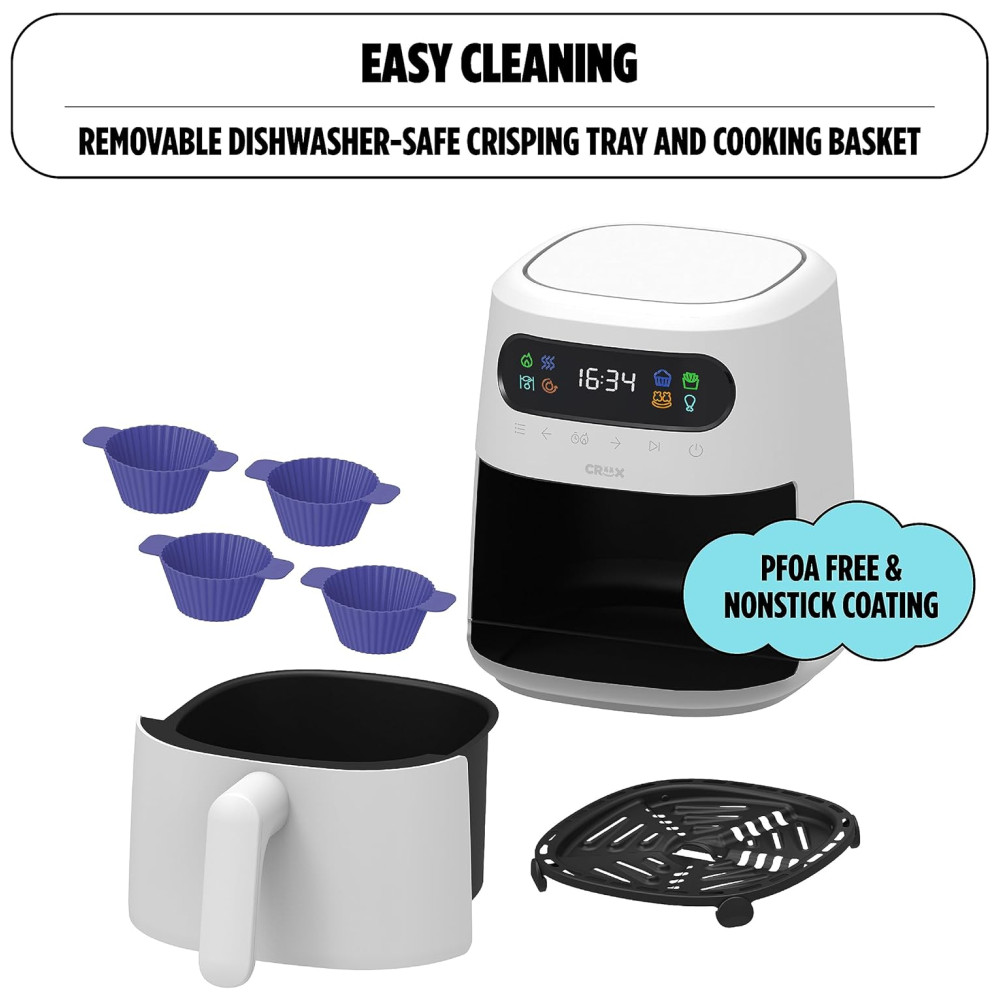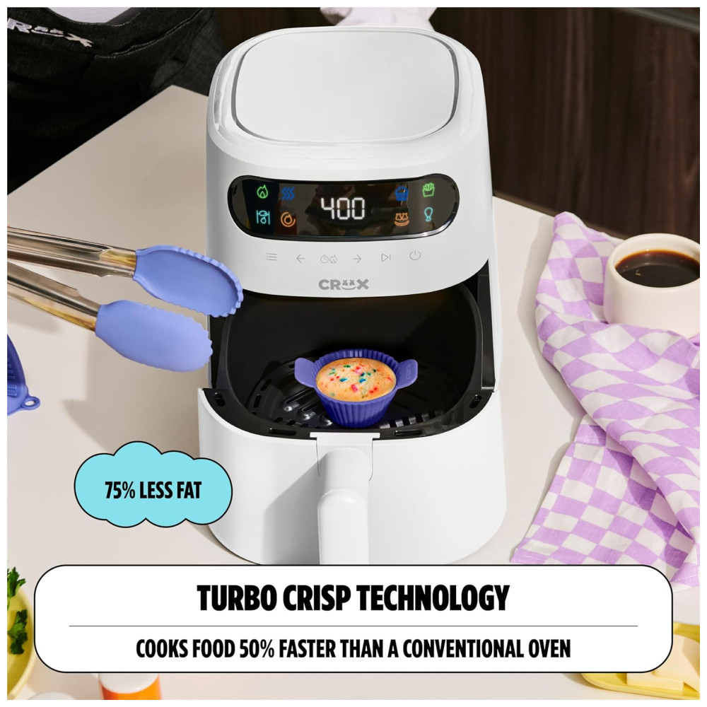 BÔNUS EXTRA PARA DIVERSÃO EXTRA: Liberte sua criatividade e prepare jantares únicos que irão impressionar seus amigos e familiares. Nossas modernas e divertidas air fryers vêm com uma bandeja de crispagem TurboCrisp patenteada e 4 moldes de cupcake de silicone CRUX x Marshmello personalizados.