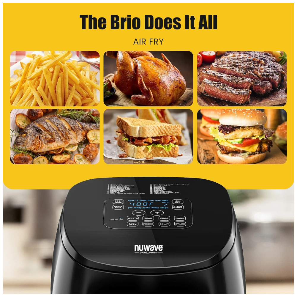 O Que Está Incluído: A Brio de 4,3 litros vem com a cesta de metal e a câmara de cozimento, livro de receitas e acesso ao aplicativo de culinária NUWAVE Cooking Club.