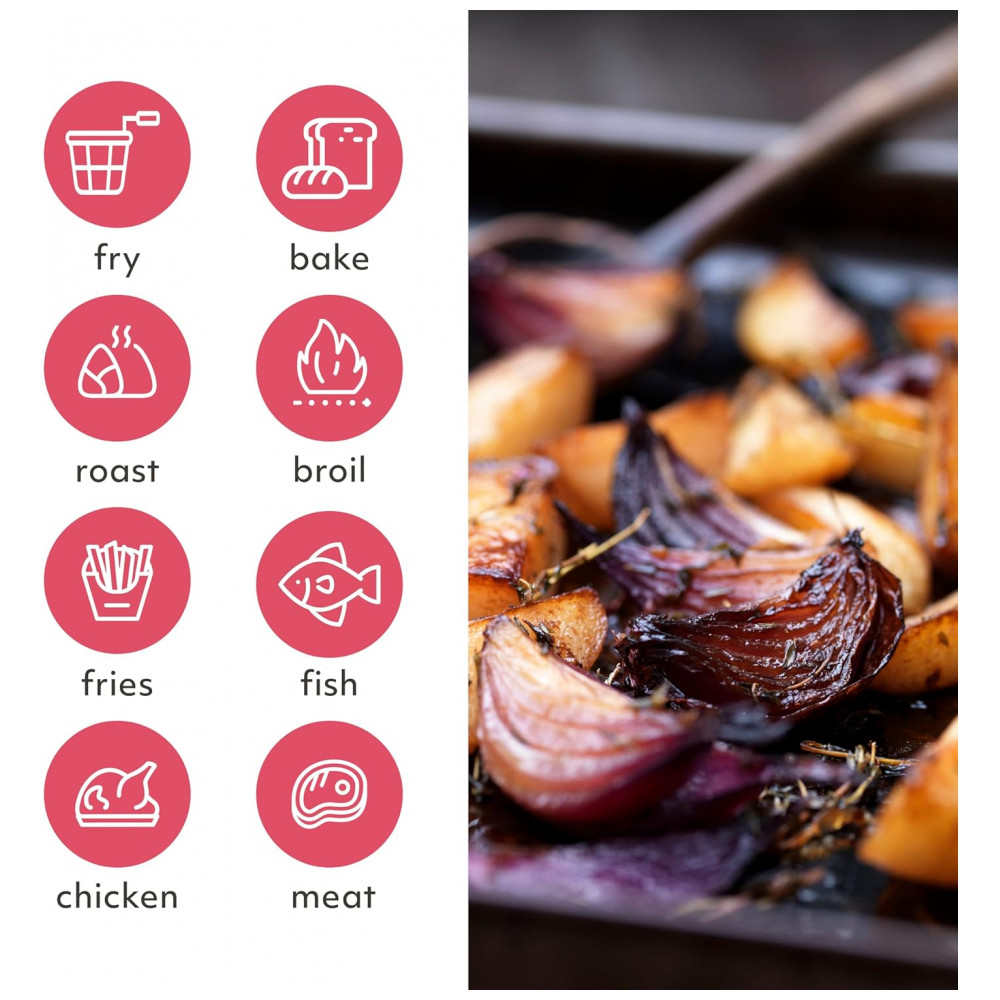 Esta fritadeira de ar quente é uma ferramenta versátil para sua cozinha. Com cinco funções diferentes Air Fry, Bake, Assado, Grelhado e Reaquecido você pode cozinhar uma ampla variedade de alimentos com facilidade.