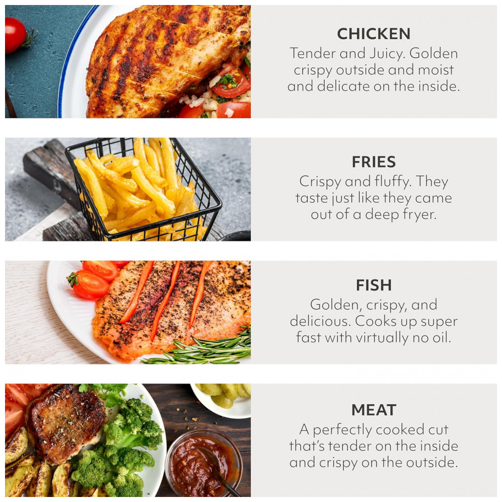 Além disso, há 10 predefinições disponíveis, incluindo frango, batatas fritas, peixe, carne, vegetais e muito mais, para tornar a cozinha ainda mais fácil.
