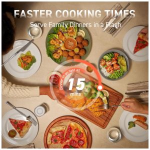 Recurso Especial: 9 Funções de Cozimento Versáteis, 5 Níveis de Velocidade de Ventilador, 4 Modos Turbo, Mais de 100 Receitas no Aplicativo com Informações Nutricionais, Faixa de Temperatura de 32°C a 232°C, Prato de Crocância Melhorado com Pequenos Orifícios Densos, Operação Silenciosa com Início Suave.