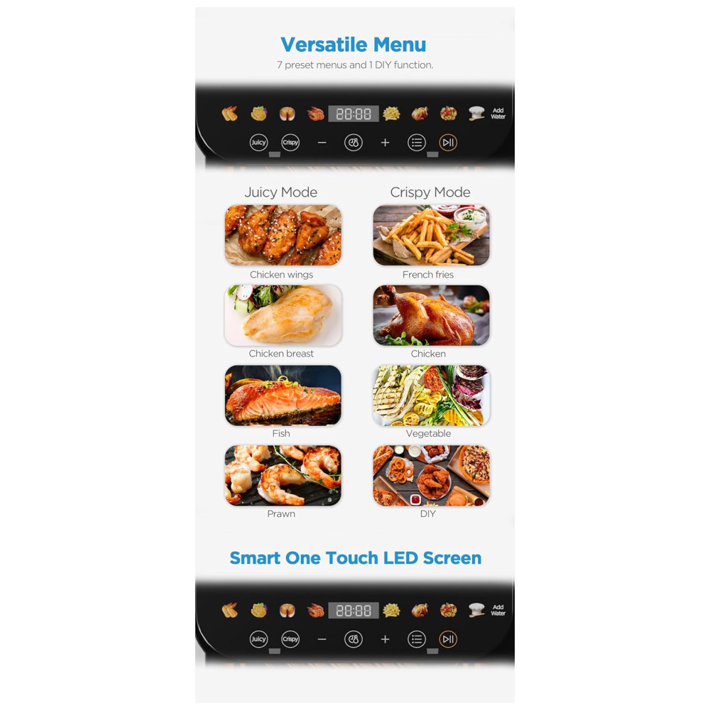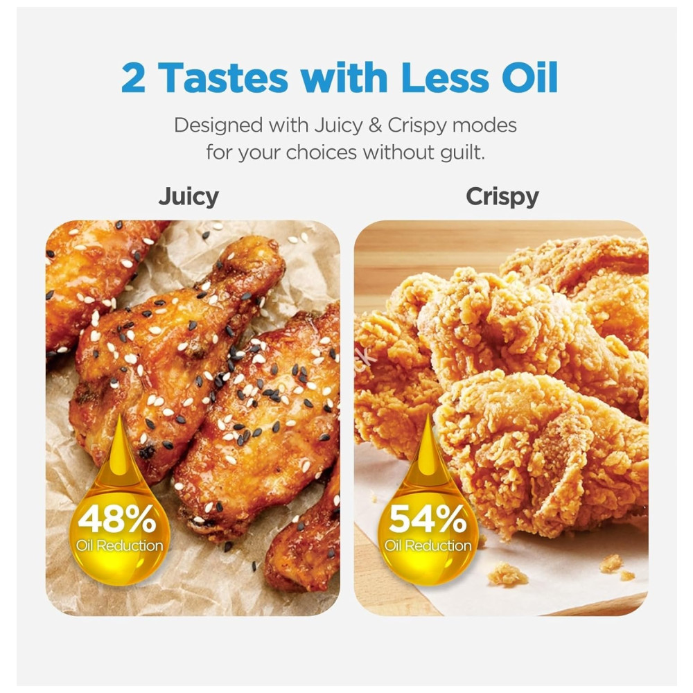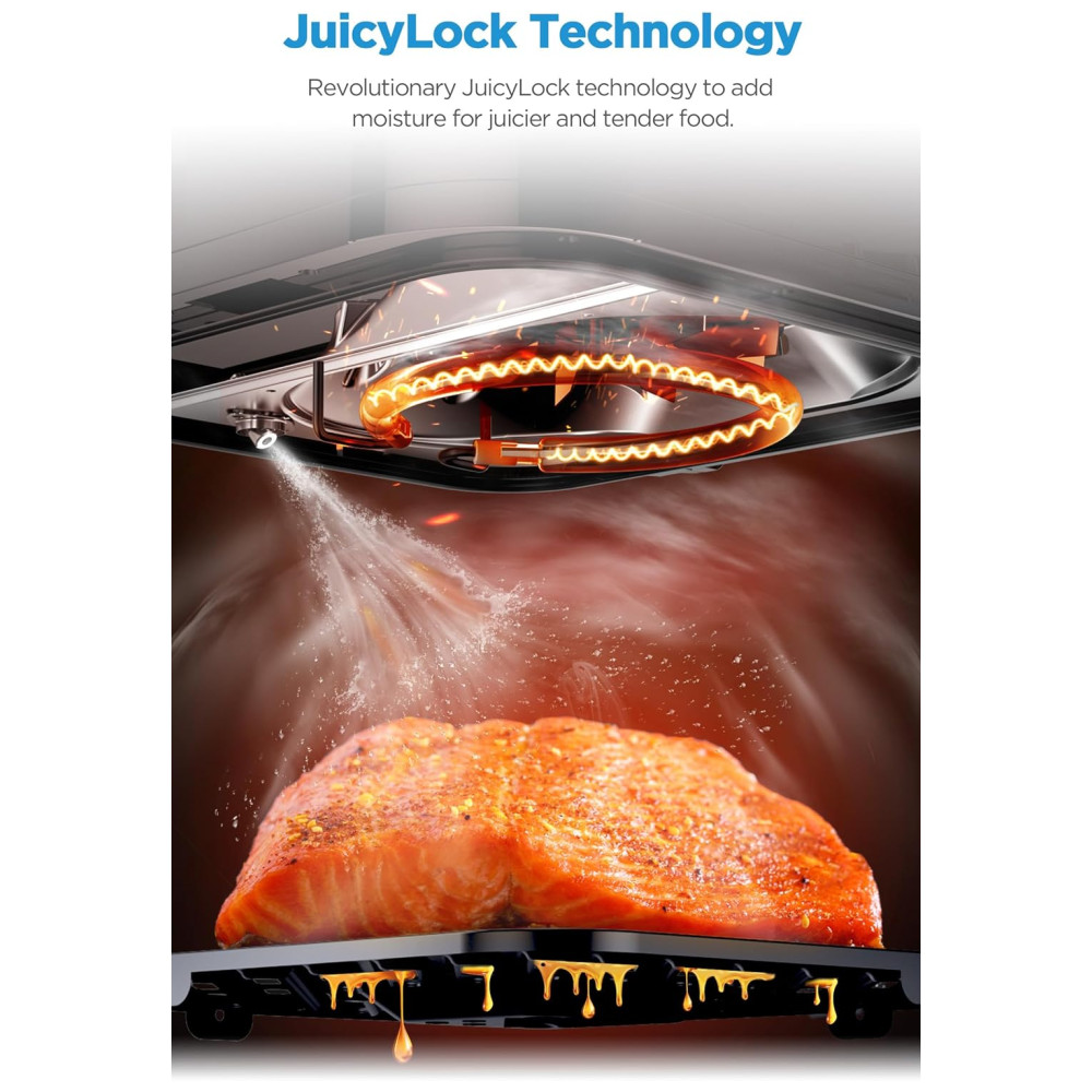 Tecnologia JuicyLock: Com um gerador de spray úmido embutido, cria umidade na fritadeira enquanto a tecnologia de ar quente 360° garante aquecimento uniforme, proporcionando alimentos suculentos, tenros e saborosos com menos óleo.