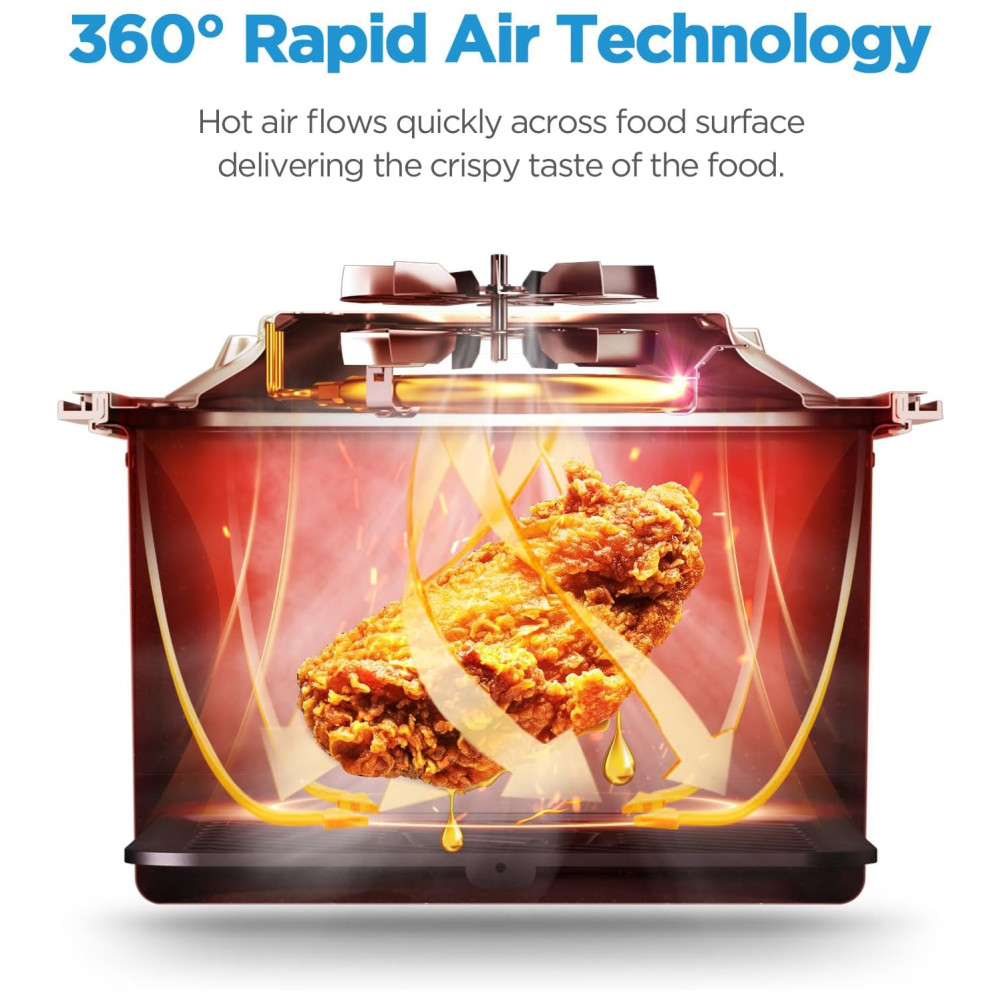 Tecnologia de Ar Rápido 360°: A tecnologia de ar rápido 360° combina um motor potente e um aquecedor que formam um envoltório quente para cozinhar os alimentos de forma rápida e uniforme. Você pode desfrutar de alimentos com crocância por fora e suculência por dentro, além de menos óleo e mais saúde. Com 1300W de potência, você cozinha mais rápido e economiza tempo.