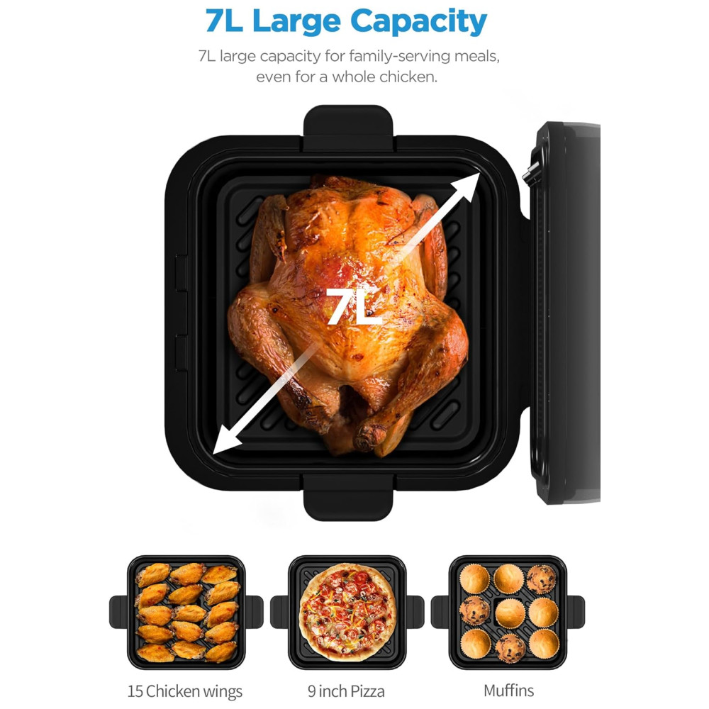 7 Predefinições e 1 Função DIY: As 7 predefinições incluem: asas de frango, peito de frango, peixe, camarão, batatas fritas, frango e vegetais. A função DIY permite controlar a temperatura de 40°C a 200°C e o tempo até 12 horas para diferentes necessidades de cozimento. Não suporta a troca para Fahrenheit.